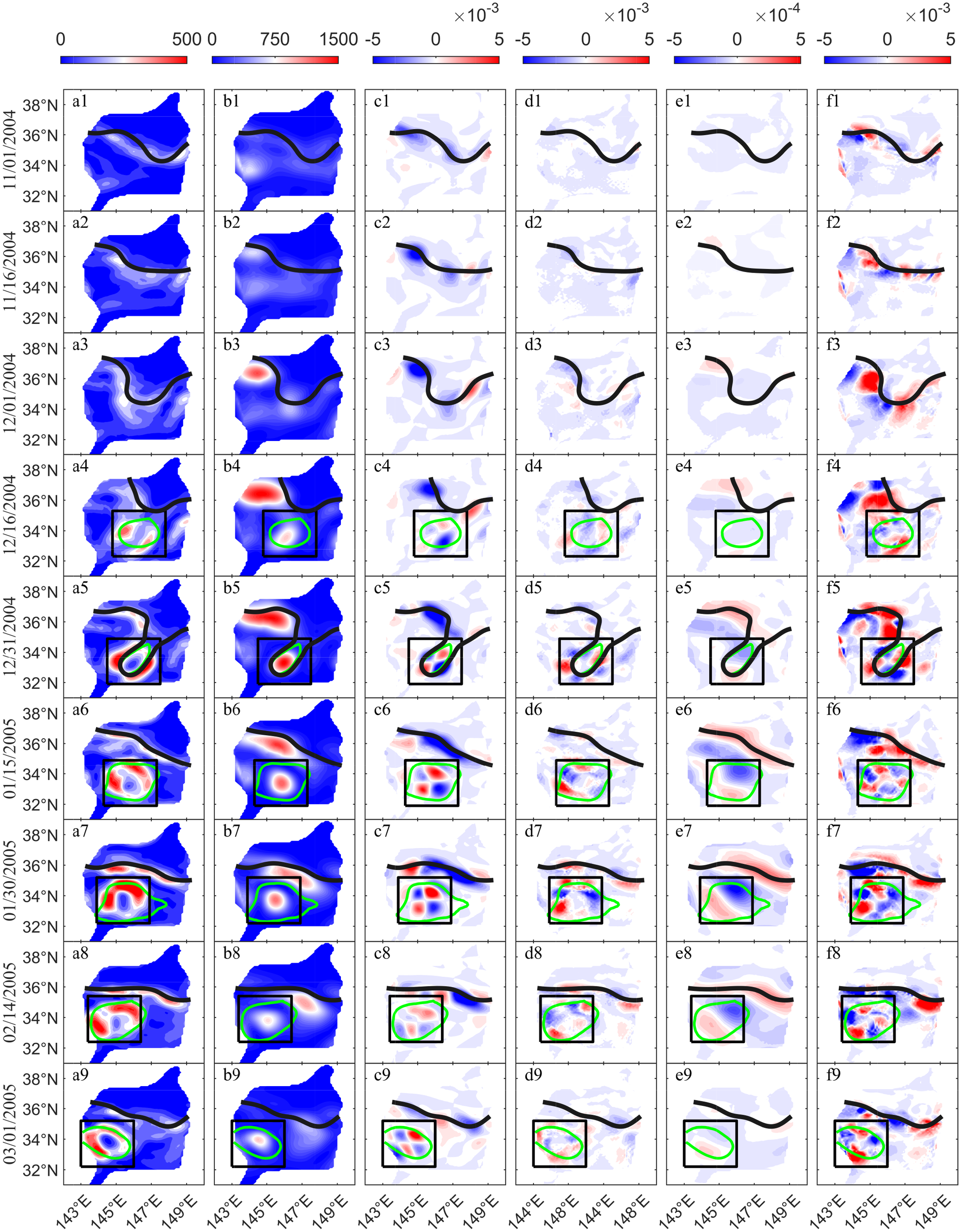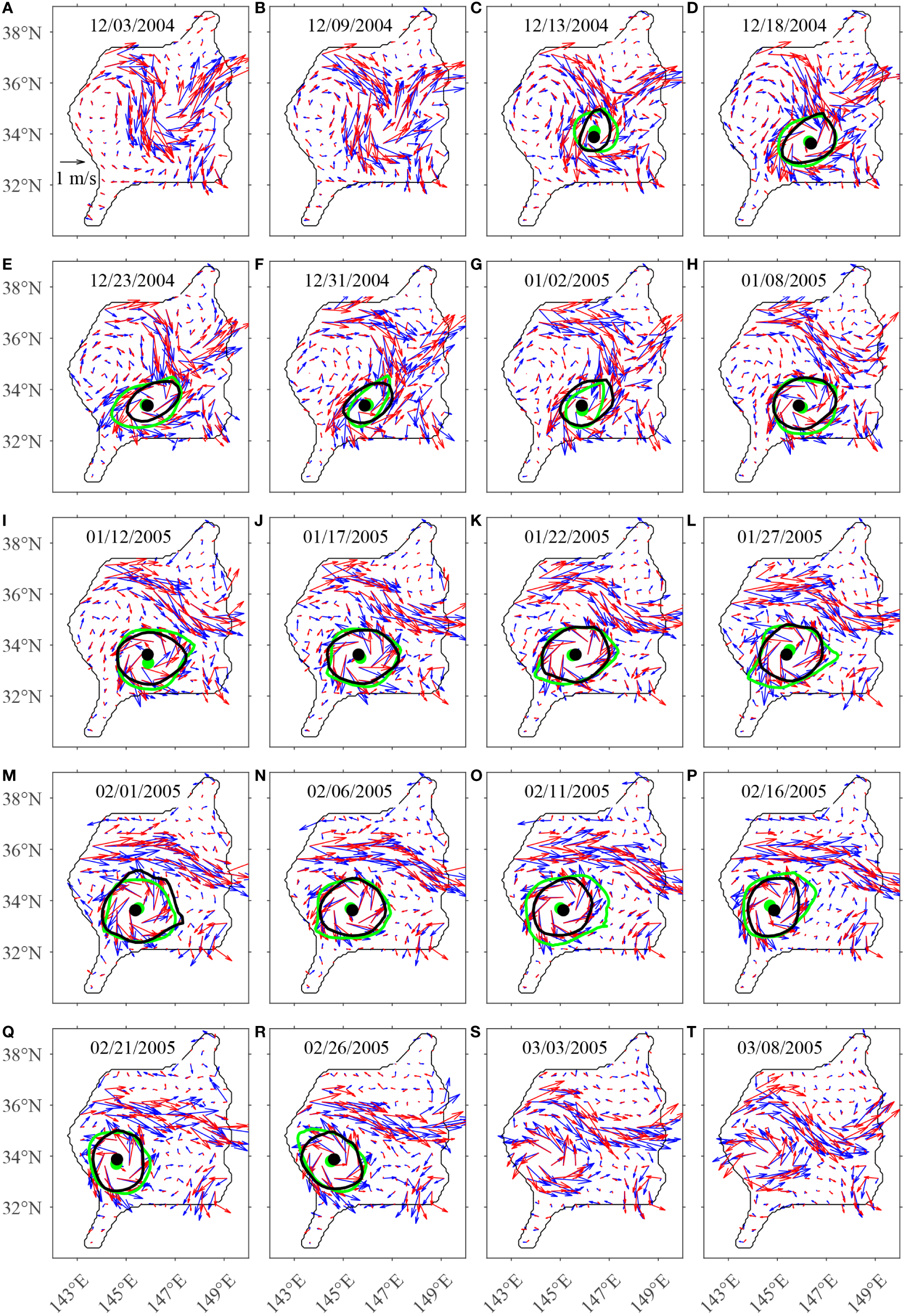 On December 9, 2004, the Kuroshio curved southward and formed a nearly circular cyclonic eddy (Figure 3B). Subsequently, the eddy grew rapidly near 146°E, 34°N and was completely shed off from the Kuroshio main axis on January 8, 2005 (Figure 3H). The eddy was nearly circular and moved westward at an average speed of 7.4 km/d in the next 2 months. The CPIES array captured the complete structure of the eddy during December 2004–February 2005. In March, part of the eddy had left the CPIES array (Figures 3S, T) and is therefore not discussed in the study. The variability of the eddy over a total of 83 days from generation to the time it partially left the observation area was studied.