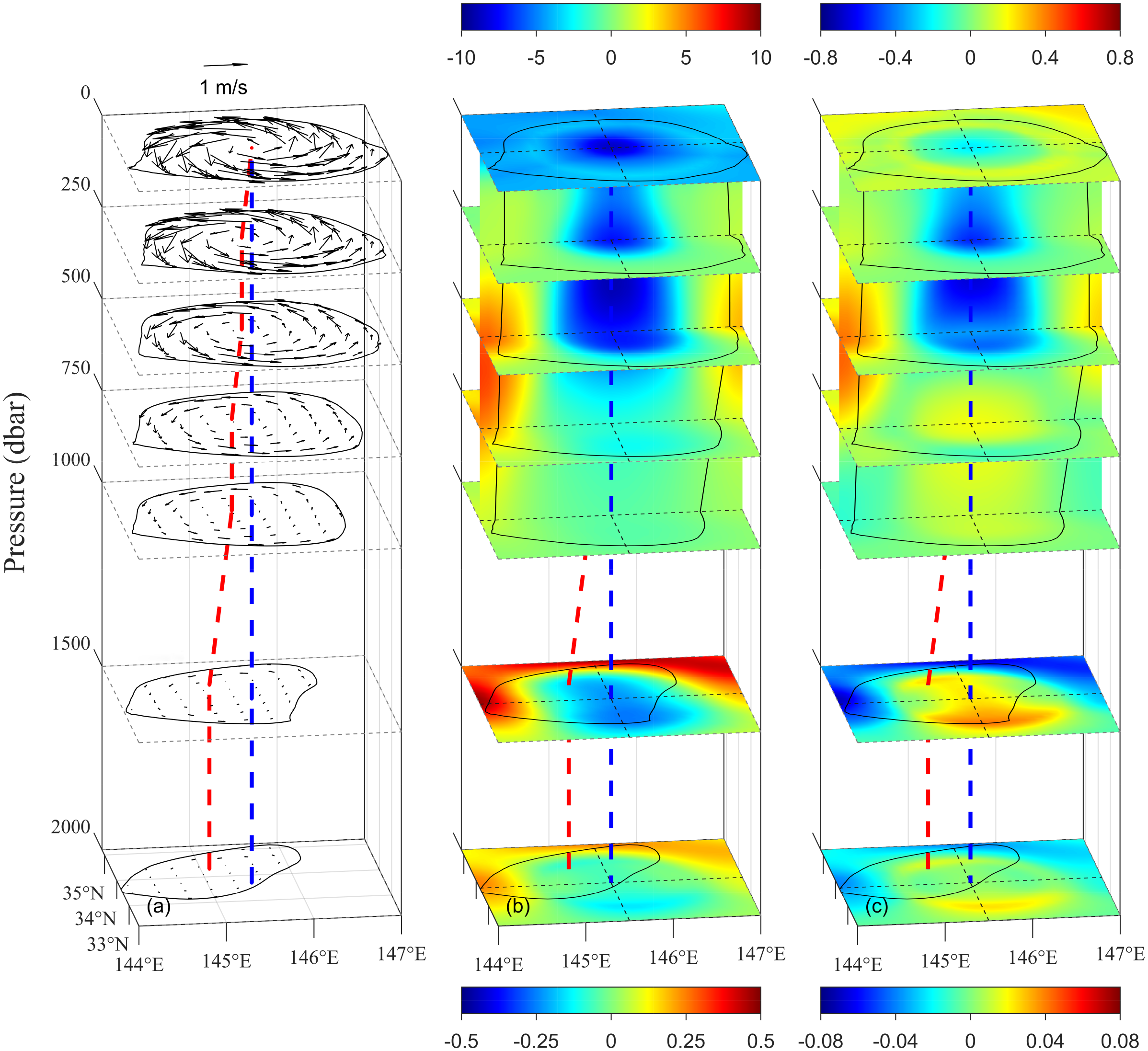 Three dimensional view of the (A) velocity (m/s), (B) temperature anomaly (°C), and (C) salinity anomaly (psu) structure of the eddy on February 1, 2005. The red dashed line connects the eddy centers, the blue dashed line is the projection of the surface eddy center on each layer, and the black line indicates the eddy boundary at each layer.