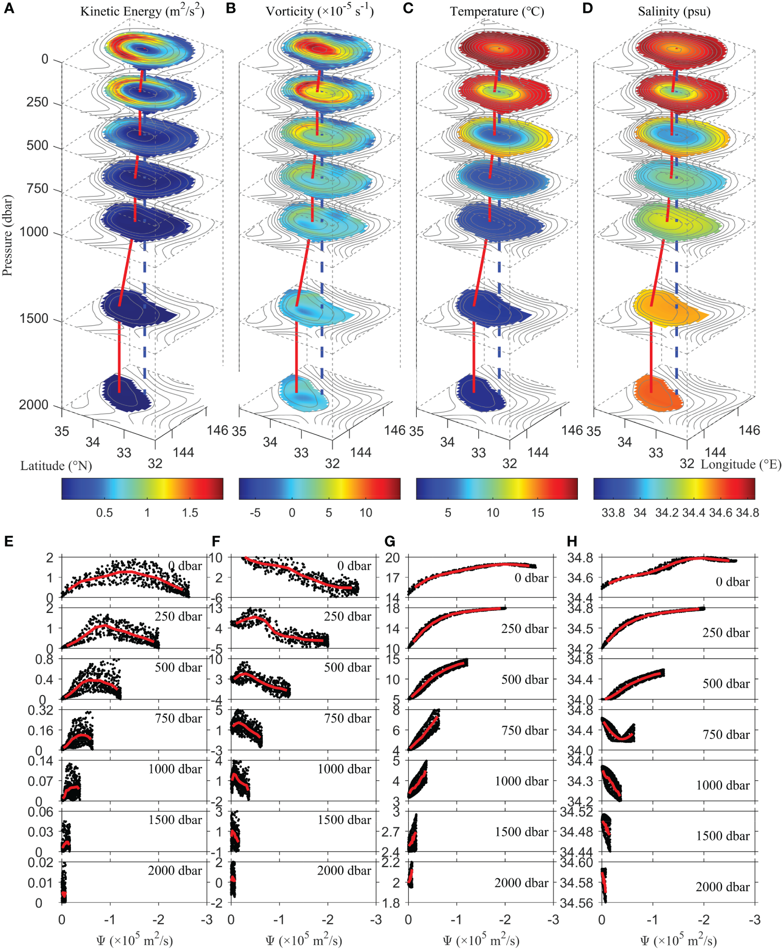 Three-dimensional structure of (A) eddy kinetic energy (), (B) vorticity (), (C) temperature, and (D) salinity on February 1, 2005 at 0, 250, 500, 750, 1,000, 1,500, and 2,000 dbar. Blue dashed line marks the vertical projection of the surface eddy center, and red solid line connects the eddy centers in the layers. Gray lines indicate the contours of the stream function of each layer relative to the eddy center. (E–H) Black dots correspond to the stream function values at depth with respect to kinetic energy, vorticity, temperature, and salinity. Red solid line indicates the mean value at the stream function per 1 × 10-6 m2/s.