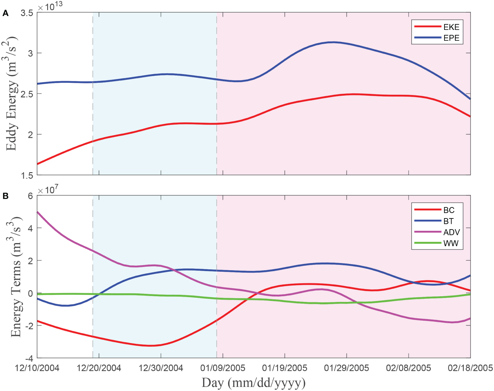 Time series of the plane integrals of the energy terms in the region where the eddy is located (black box in Figure 7). (A) shows eddy kinetic energy (EKE) and eddy potential energy (EPE), and (B) shows baroclinic conversion (BC), barotropic conversion (BT), advective term (ADV), and wind stress work (WW) values. White, cyan and pink background color indicate the periods of generation, separation, and stabilization, respectively.