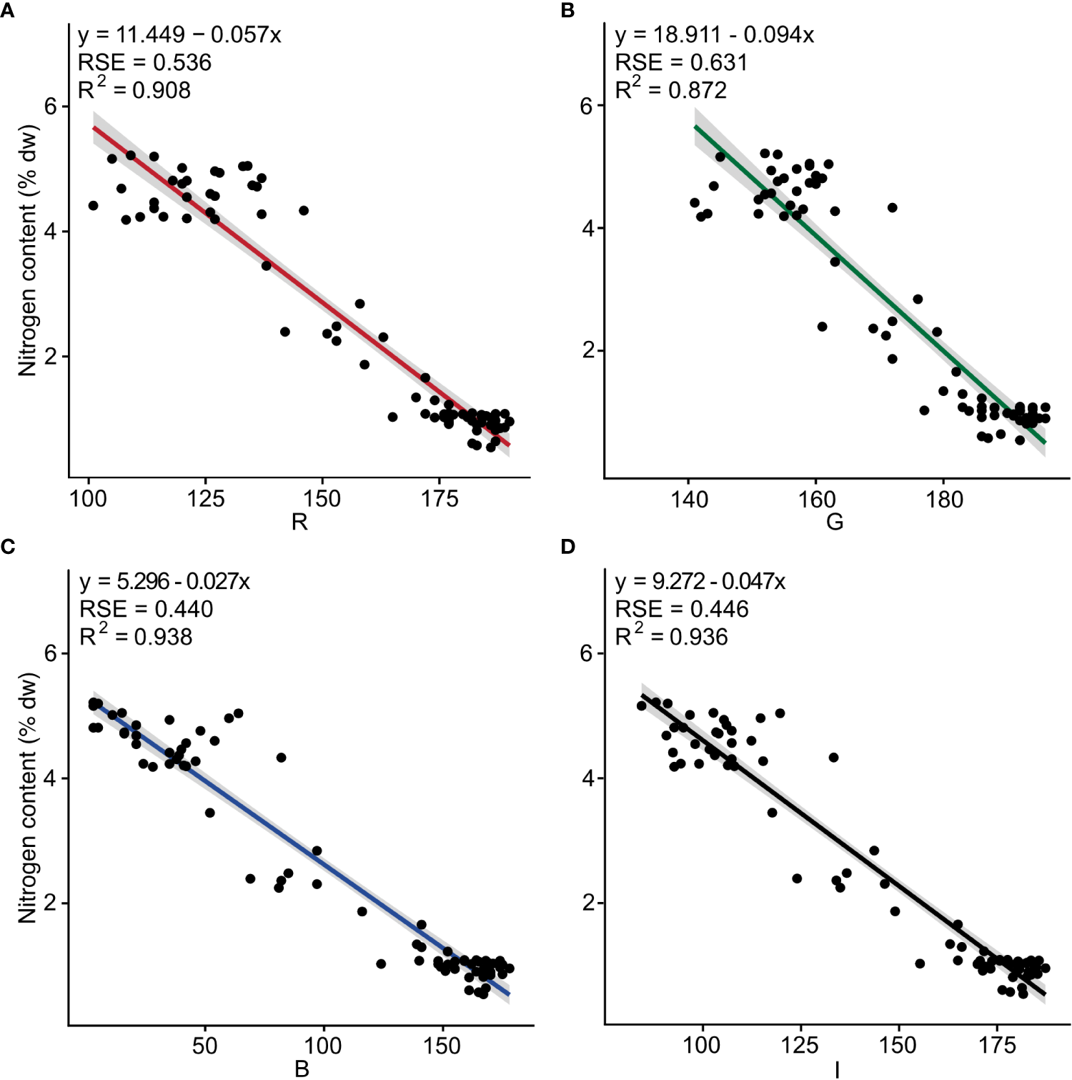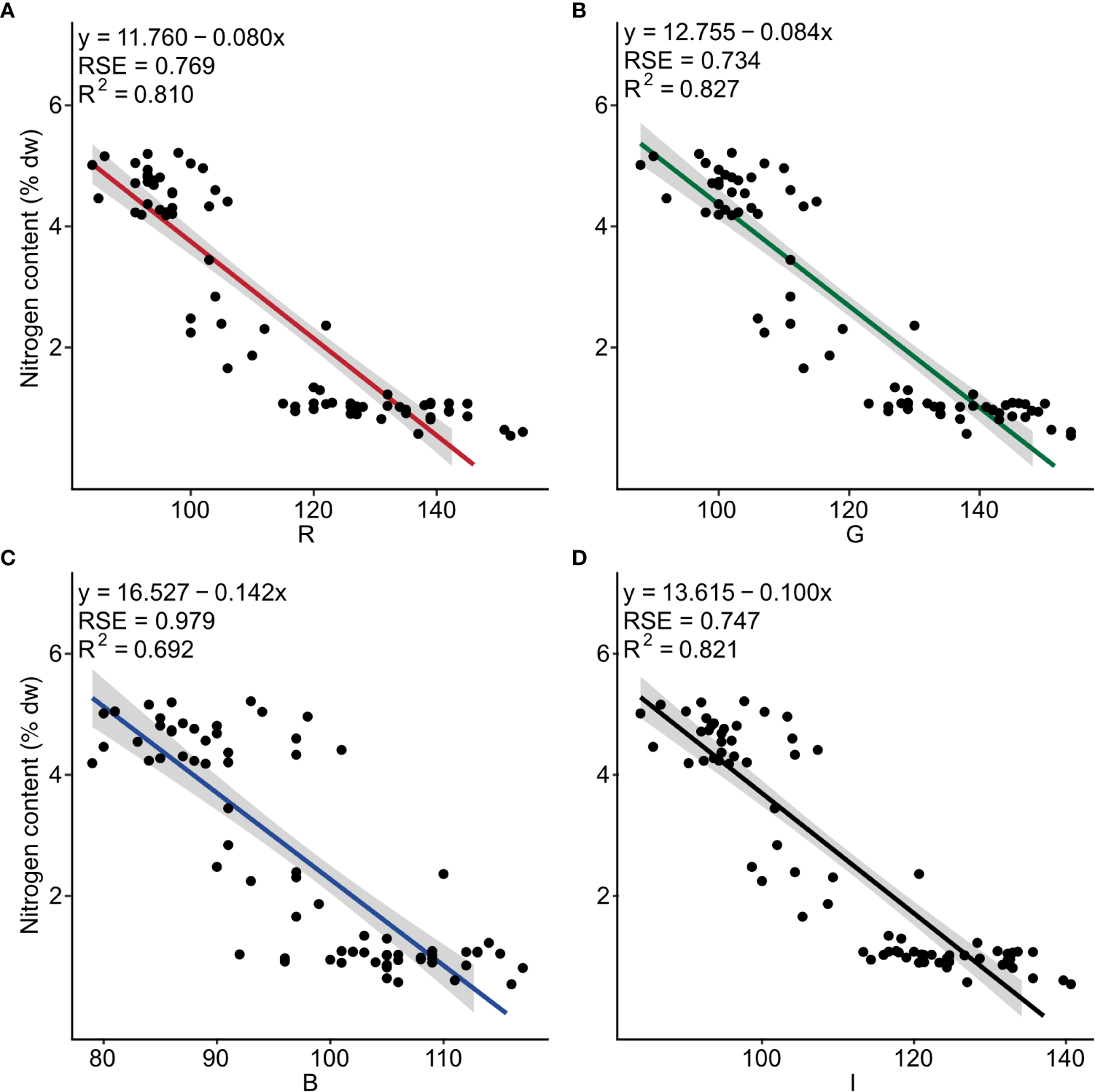 Negative linear relationships were observed between nitrogen content and the three band colors R (F1, 73 = 311, p< 0.001), G (F1, 73 = 349, p< 0.001), B (F1, 73 = 164, p< 0.001), as well as for I (F1, 73 = 334, p< 0.001). The determination coefficient (R2) was 0.810, 0.827, 0.692, and 0.821, respectively (Figure 2 and Table S4).