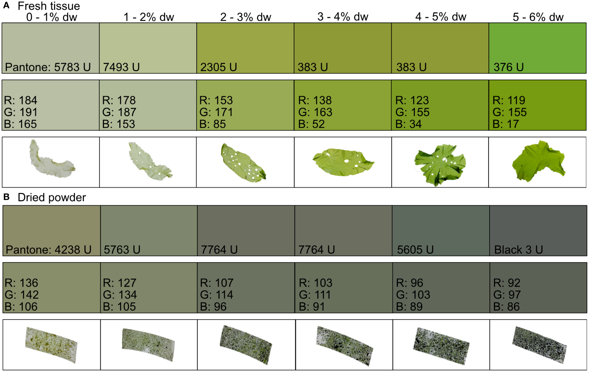 Color guide with the matched Pantone® uncoated matt color to the red (R), green (G), and blue (B) values of the (A) fresh tissue and (B) dried powder of Ulva fenestrata divided into six different groups based on its nitrogen content (% dw).