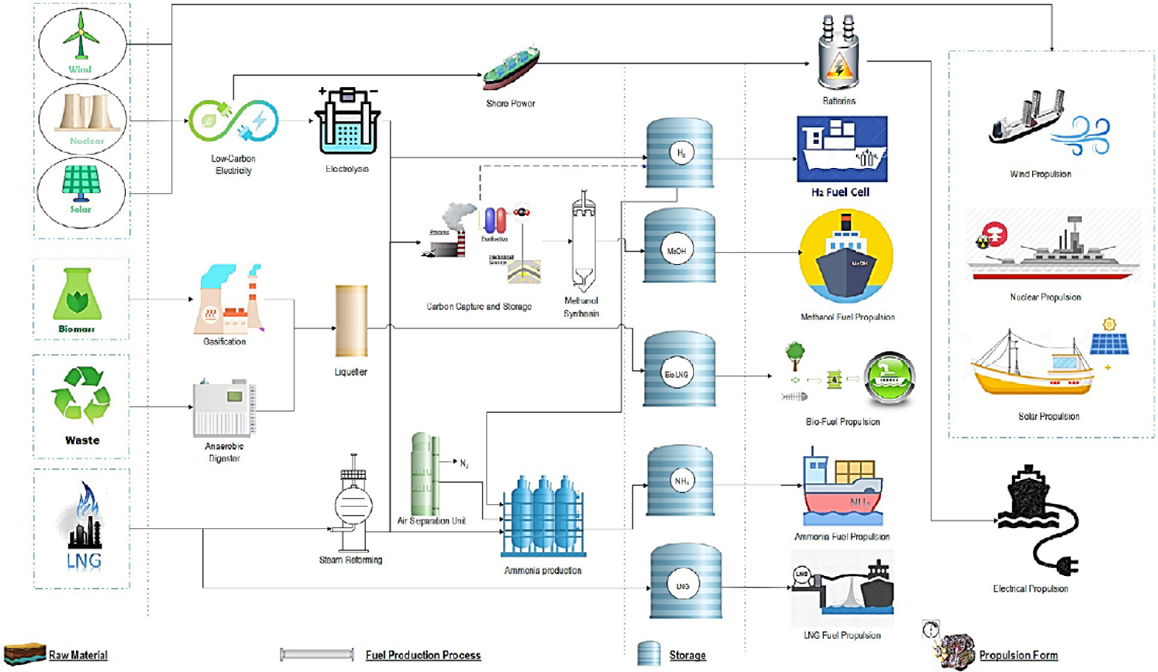 Technologies and fuels on a pathway to maritime decarbonization. Source: Department for Transport, 2019; Al-Enazi et al., 2021.
