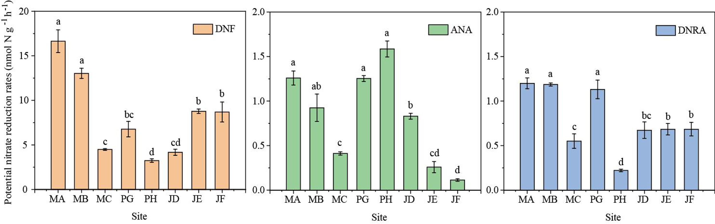 Sediment potential DNF, ANA and DNRA rates in the shrimp ponds. Different letters indicate significant differences (p < 0.05) among different sites. Error bars represent the standard deviation(n = 3).