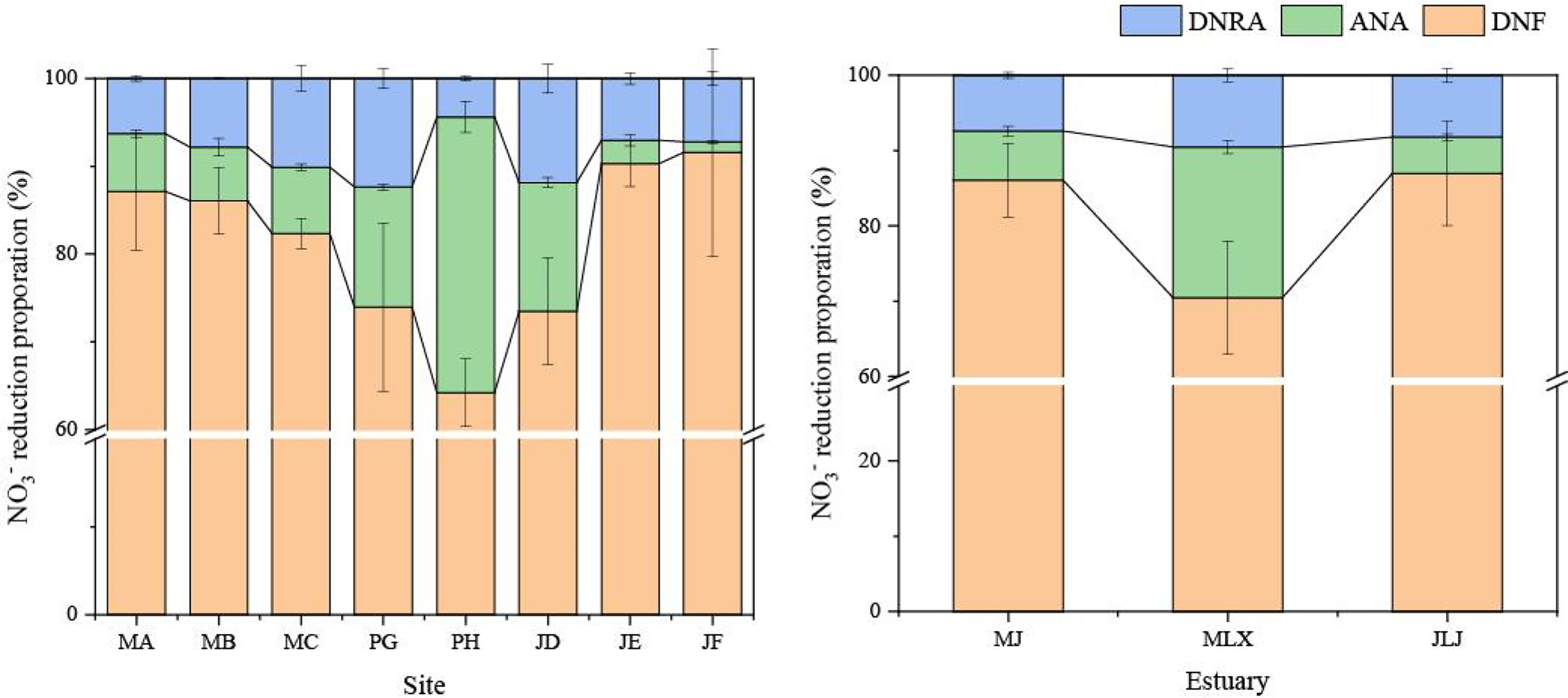 Relative contributions of DNF, ANA and DNRA to total NO3- reduction in the shrimp ponds. Error bars represent the standard deviation.