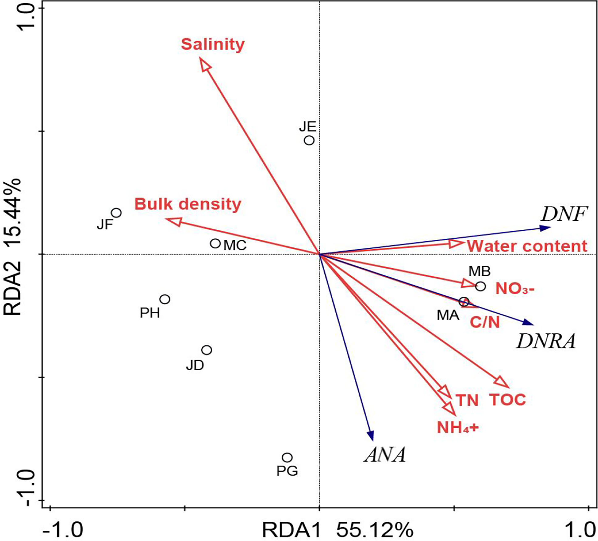 Ordination diagram showing the results of RDA of NO3- reduction processes and soil physicochemical characteristics. The hollow circles represent individual sediment samples from the eight shrimp ponds in the subtropics Estuary. The red arrows represent soil physicochemical characteristics, and blue arrows represent NO3- reduction processes.