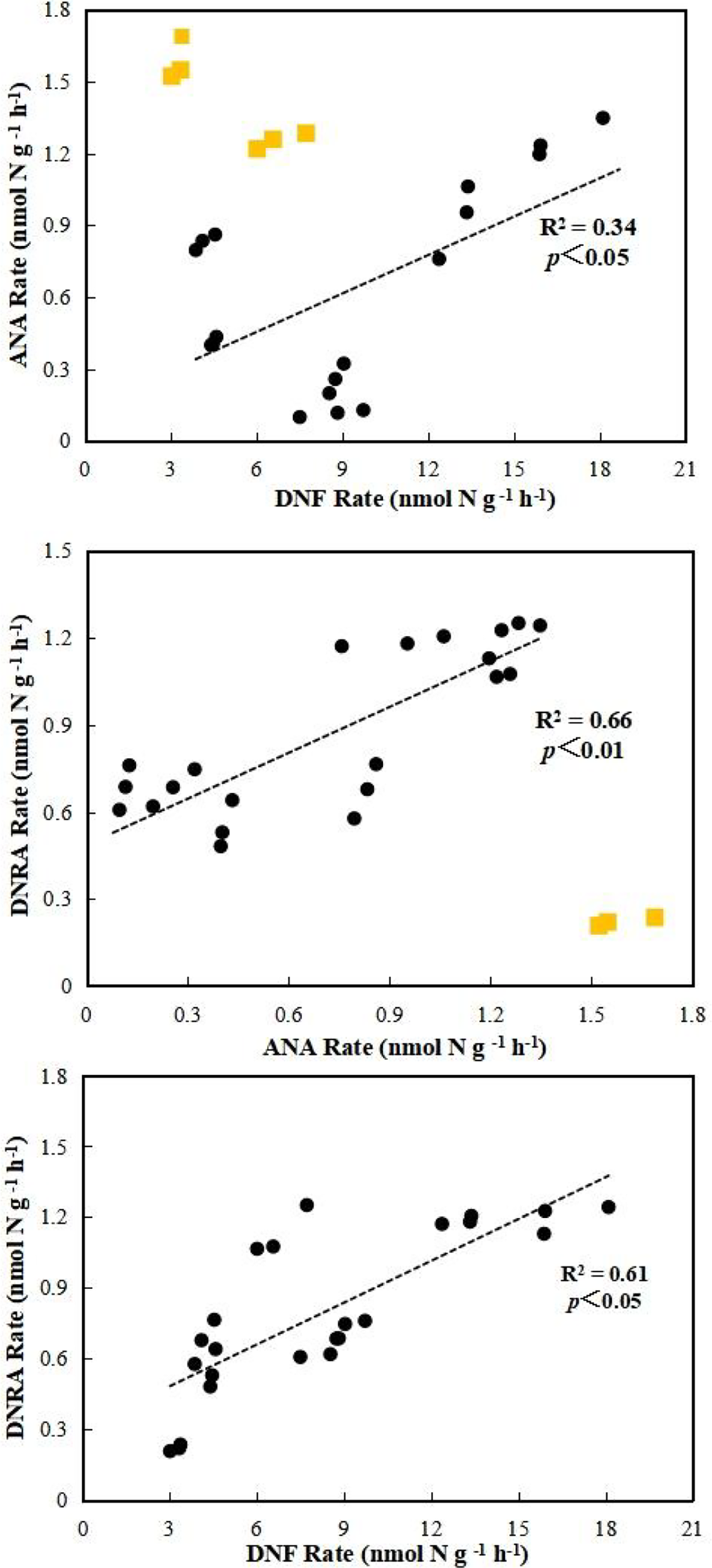 Correlations between DNF, ANA and DNRA rate. The linear regression is shown for the relation between DNF, ANA and DNRA rate. R2 represents regression coefficient, and Yellow points represents not included in the statistics.The significance level was set at 0.05 and 0.01.