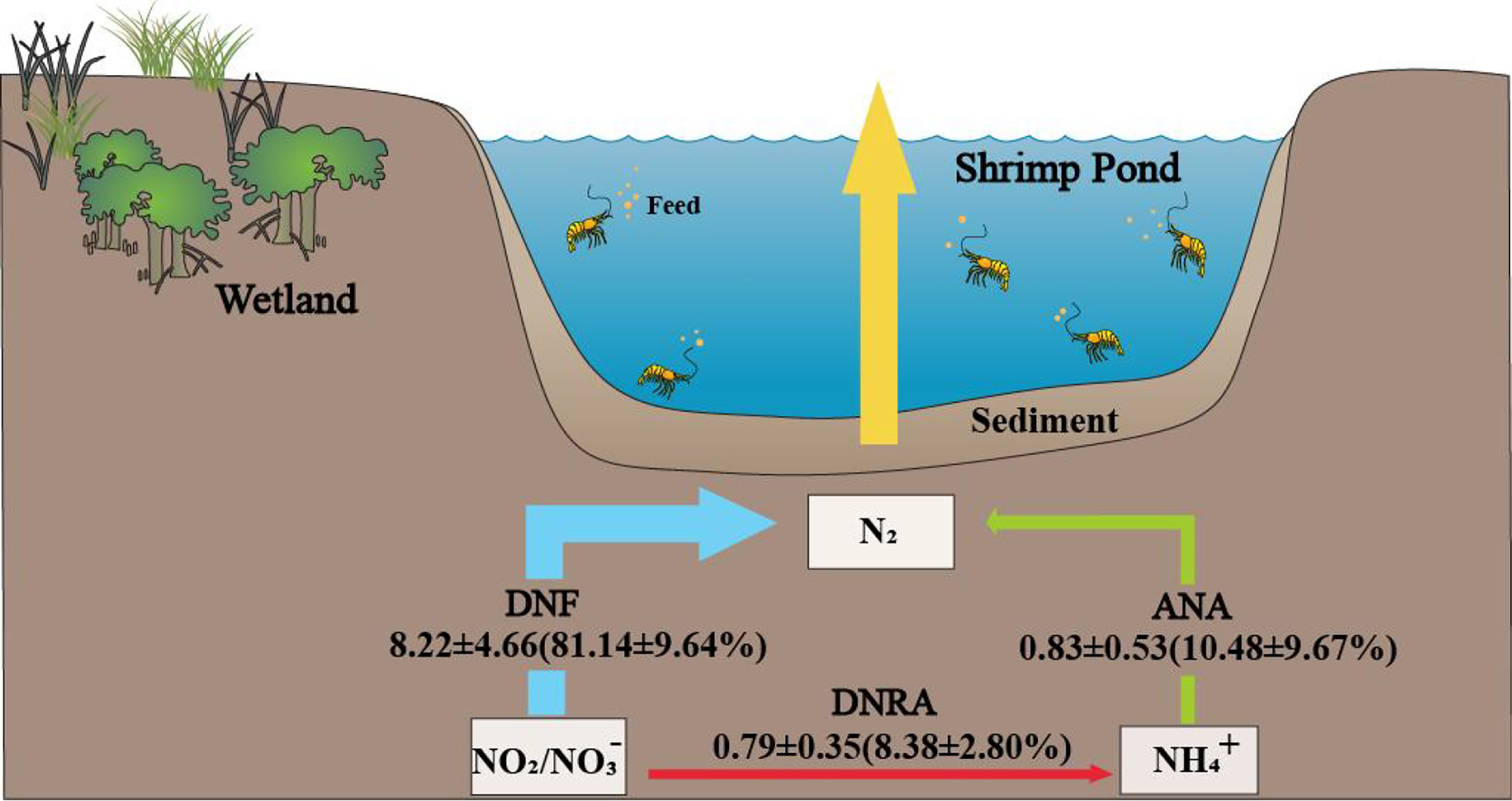 The conceptual map on NO3− reduction processes in the shrimp pond sediment. The unit of DNF, ANA, and DNRA rates were nmol N g-1 h-1.