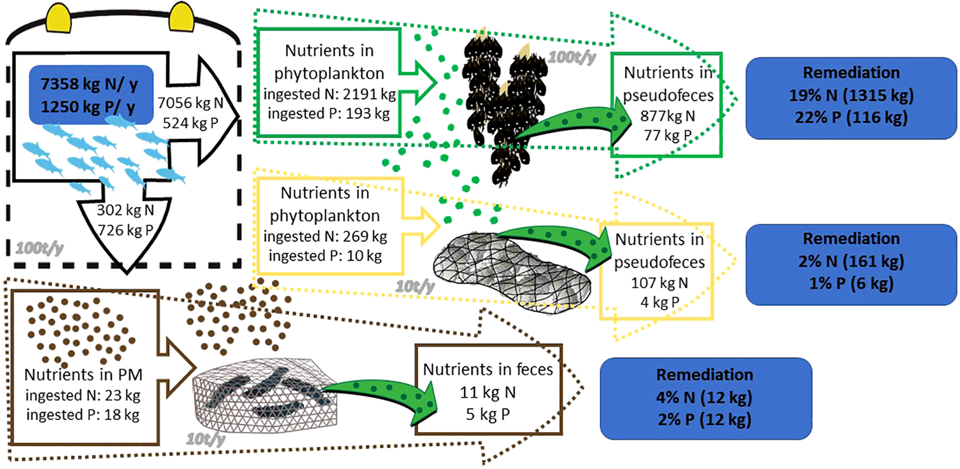 For the IMTA bivalves nutrient remediation, the calculation exercise (Figure 1) showed that near a fish farm with a production of 100 t/y, the co-cultivation with 100 t/y of mussels can remove from the system 19% of nitrogen and 22% of phosphorus derived from the secretions of fish. Respectively, the co-cultivation of fish and 10 t/y of pearl oysters removes 2% N and 1% P. Finally, the annual co-cultivation of 10 t/y sea cucumbers can absorb the 4% particulate N and 2% particulate P derived from the fish excretions.