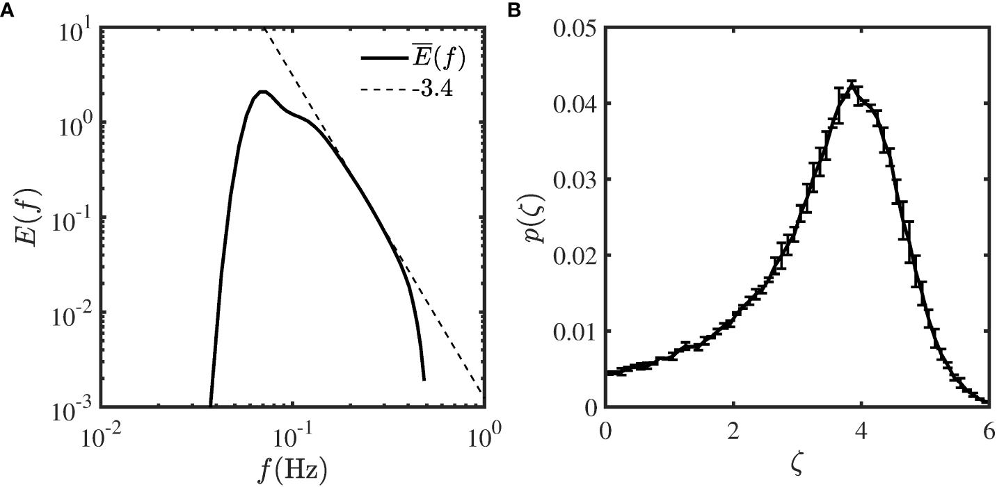 (A) Measured mean wave spectra collected by NDBC buoy 46086. (B) Measured PDF of scaling exponents in the wave spectra. The statistical difference between two subsets with equal sample size is indicated by error bar.