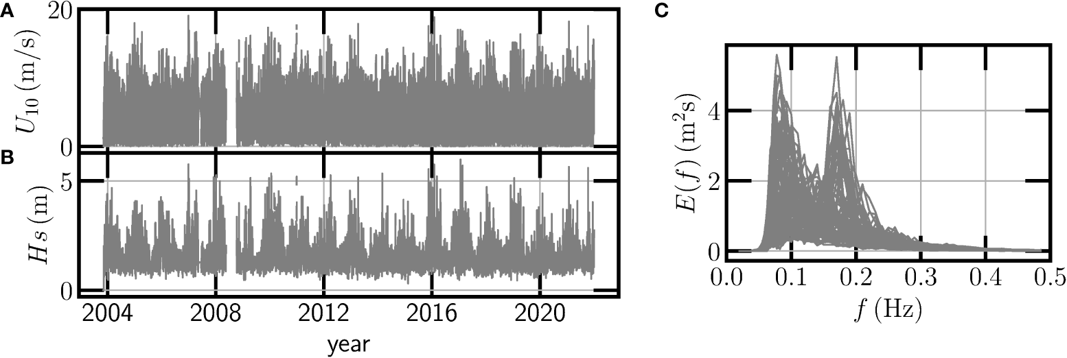 Note that, to keep the self-consistency of this work, the parameters Cd and z0 are the same as those in the second dataset (Ribal and Young, 2019). Finally, applying z1=4.1 m in the above equation, the converted wind speed at 10 m can be expressed in a simplified way as U10=1.084U4.1. A further test shows that a variation of the height, e.g., 3≲z1≲5 m, will have less than 2% difference in the estimation of U10. Figures 2A, B show the hourly U10 and Hs data collected by the NDBC buoy 46086, where annual cycles for wind speed and wave height are visible. Moreover, the corresponding hourly wave spectra with frequency on the range 0.02≤f≤0.485 Hz are also used to perform the SEP algorithm to retrieve the swell wave and wind waves: see the example of five days wave spectra during 27-31 December 2021 in Figure 2C. Two regimes are distinguished, the one with high frequency (e.g., f≥0.15 Hz) corresponds to the wind waves, and another one with low frequency (e.g., f≤0.15 Hz) indicates the swell waves.