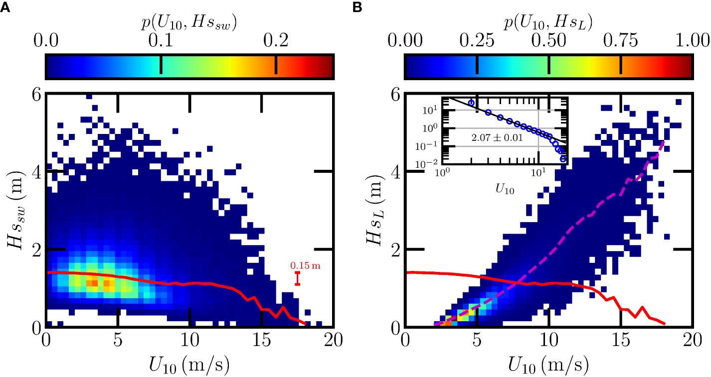 Figure 4B shows the joint PDF of U10 and HsL, where the conditional mean wind wave is illustrated by a dashed curve. To emphasize the assumption mentioned above that in small wind conditions the local wind wave is surpassed by the regular swell wave, the ratio between extracted swell wave and wind wave is shown in the inset of Figure 4B in a log-log plot. It suggests that the swell wave dominates the collected significant wave height when U10≪8 m/s. Moreover, a power-law decay for the ratio is found, in which an empirical exponent 2.07±0.01 is obtained. These results validate the assumption we made in the probability analysis, namely, that the measured Hs(U10) is dominated by the swell wave for small wind conditions, and that the is nearly independent of the local wind, which is confirmed also by analyzing the data provided by other buoys (not shown here).