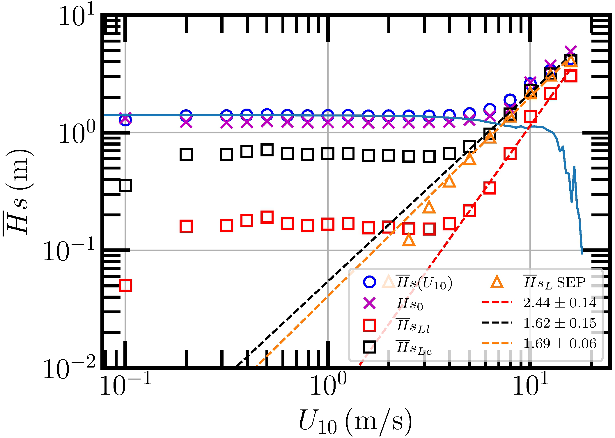 For a given U10 value, we denote as Hs0 the value of Hs corresponding to this maximum. This defines a new continuous curve, which is denoted as with the following formulation,