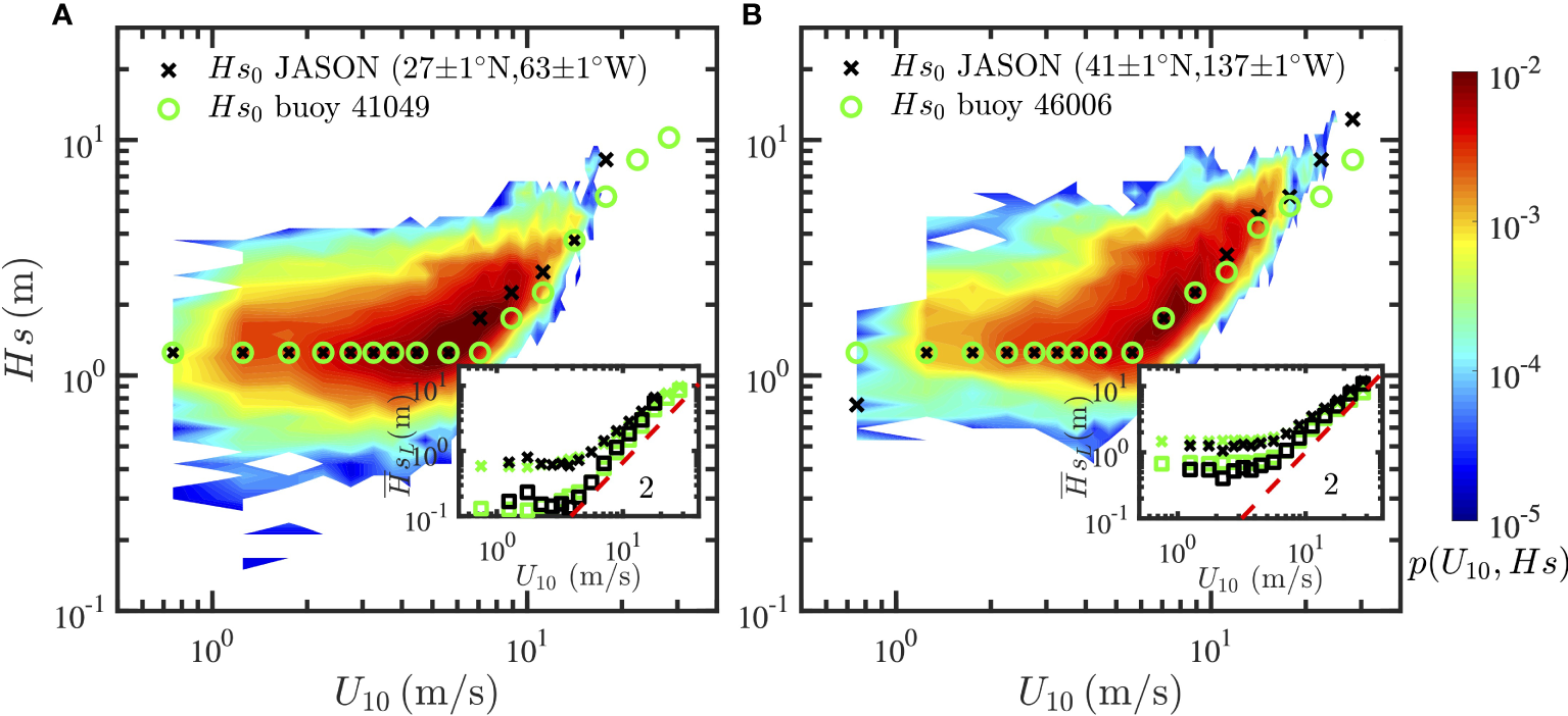 Measured joint PDFs of U10 and Hs recorded by JASON in the areas close to NDBC buoys (A) 41049 and (B) 46006. The black crosses and green circles are the skeletons of the joint PDFs for JASON and buoy data. The insets show the measured , in which the squares and crosses indicate the from linear decomposition and the from energy conserved decomposition, respectively. The colors green and black are used to indicate the results from buoy and satellite data. The dashed line is given as a reference with the slope of 2.