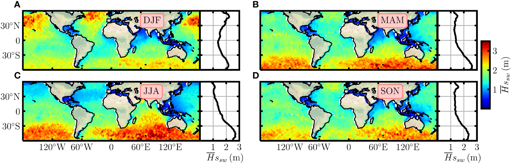 The spatial patterns illustrated in Figure 7 agree well with the ones reported by Semedo et al. (2011). For example, in DJF, large swells are seen in the extratropical areas of the Northern Hemisphere, small ones are found in several regions, e.g., the Gulf of Mexico, Indian monsoon area, South China Sea, north and east coast of Australia, to list a few. Additionally, the longitudinal averaged curve shows a nearly symmetric shape, see Figure 7A. In the Southern Hemisphere, high values are mainly found in the Antarctic Circumpolar Current (ACC) region, i.e., roughly from 48∘S to 58∘S, where there is almost no influence of the continents. In JJA, the swell is increasing from the north to the south, reaching its maximum value in the ACC region.