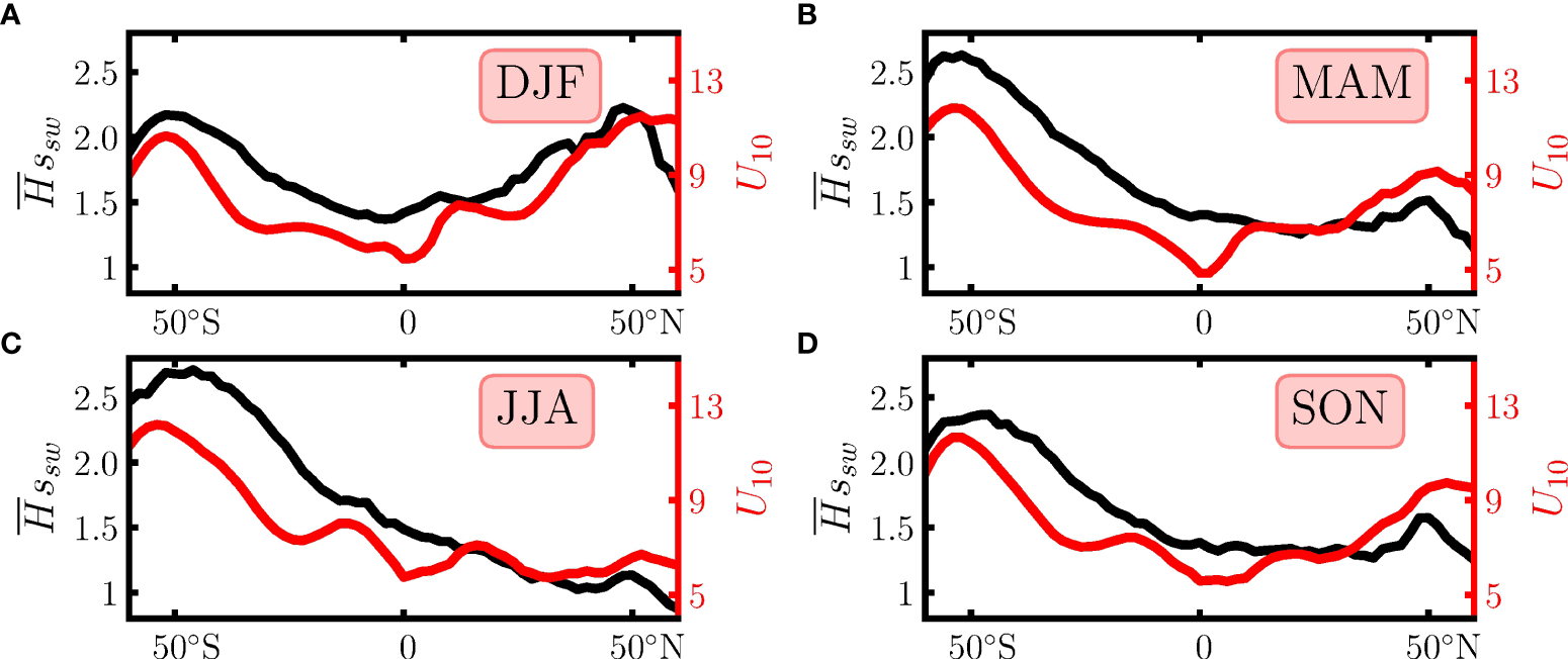 The probability-based wave decomposition procedure is performed at each geographic grid to derive and . To have a reasonable sampling size for each wind bin, we group the data into the four boreal seasons: Winter (DJF), Spring (MAM), Summer (JJA) and Autumn (SON). The derived swell is found on the range m, with a mean value around 1.8 m and a strong seasonal variation, see Figure 7. More precisely, the retrieved swell is stronger in the boreal Winter than in Summer in the Northern Hemisphere. For instance, the average around 50∘N are equal to 2.3 m and 1.2 m in DJF and JJA, respectively. This is partially due to the fact that the swell is highly positively correlated with the wind speed at high latitudes, see Figure 8, in which the black and red curves are the longitudinal averaged and U10, respectively. Similar meridional variation trends of and U10 are found, especially in high latitudes.
