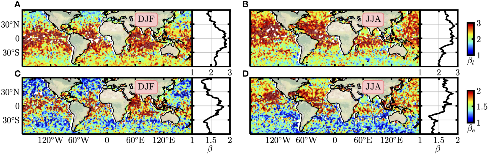 The global distributions of βl measured with linearly decomposed in (A) DJF and (B) JJA. (C, D) are the βe derived from the decomposed by energy conserved approach. The meridional variations are shown in the right panels.