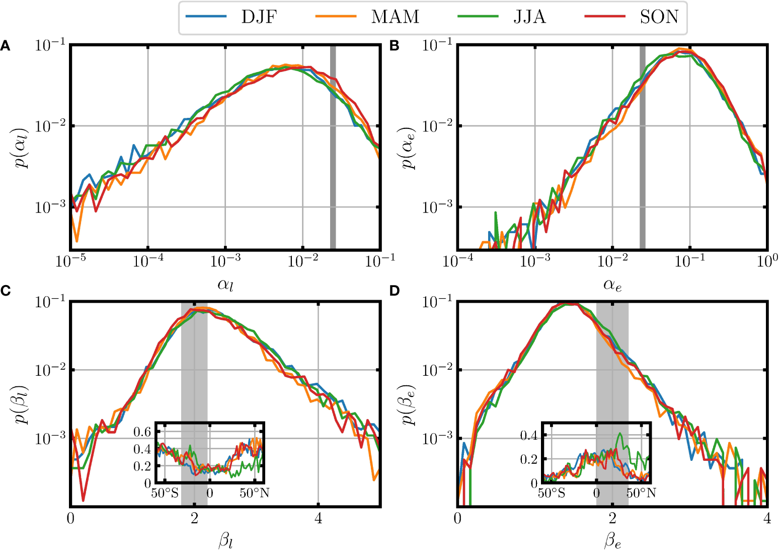 Measured PDFs for (A)αl, (B)αe, (C)βl, and (D)βe in four seasons. The insets in (C, D) are the ratios for β values in the range of [1.8,2.2] in various latitudes. The curves in different colors indicate different seasons.