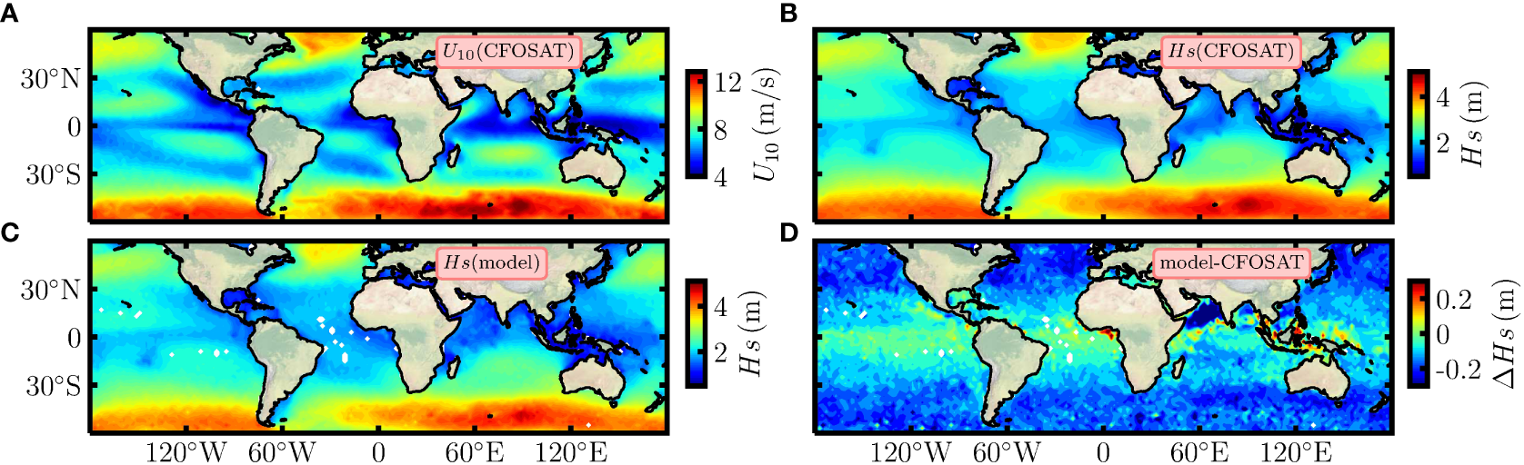 The in situ U10 and Hs data from the NDBC are of high quality and have been extensively used for studying the wind wave interactions, validating model results and calibrating satellite systems (Ebuchi et al., 2002; Evans et al., 2003; Andreas and Wang, 2007; Zieger et al., 2015). Note that, the Hs is not directly estimated by sensors on board the buoys. The buoy-equipped accelerometers or inclinometers measure the heave acceleration or the vertical displacement of the buoy hull during the wave acquisition time. Then a fast Fourier transform is applied to the data to transform the temporal information into the frequency domain. After that, Hs is derived according to Equation (5) typically over the range from 0.0325 to 0.485 Hz.