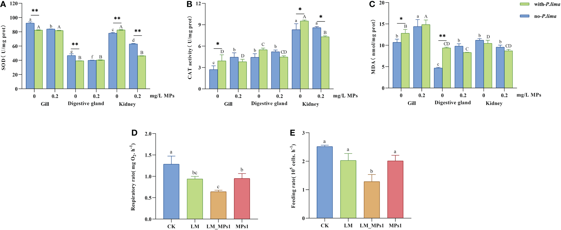 Physiology index change of M. coruscus exposure to MPs and P. lima. (A) SOD activities, (B) CAT activities, (C) MDA content, (D) respiration rate, (E) feeding rate. Different letters indicate significant differences between different tissues in different concentrations of MPs in the presence or absence of P. lima in (A, B, C) (p < 0.05), and different letters indicate significant differences in different groups in (D, E) (p < 0.05), and asterisks indicate significant differences between the presence and absence of P. lima within each fixed concentration of MPs between different tissues. (*p < 0.05; **p < 0.01).