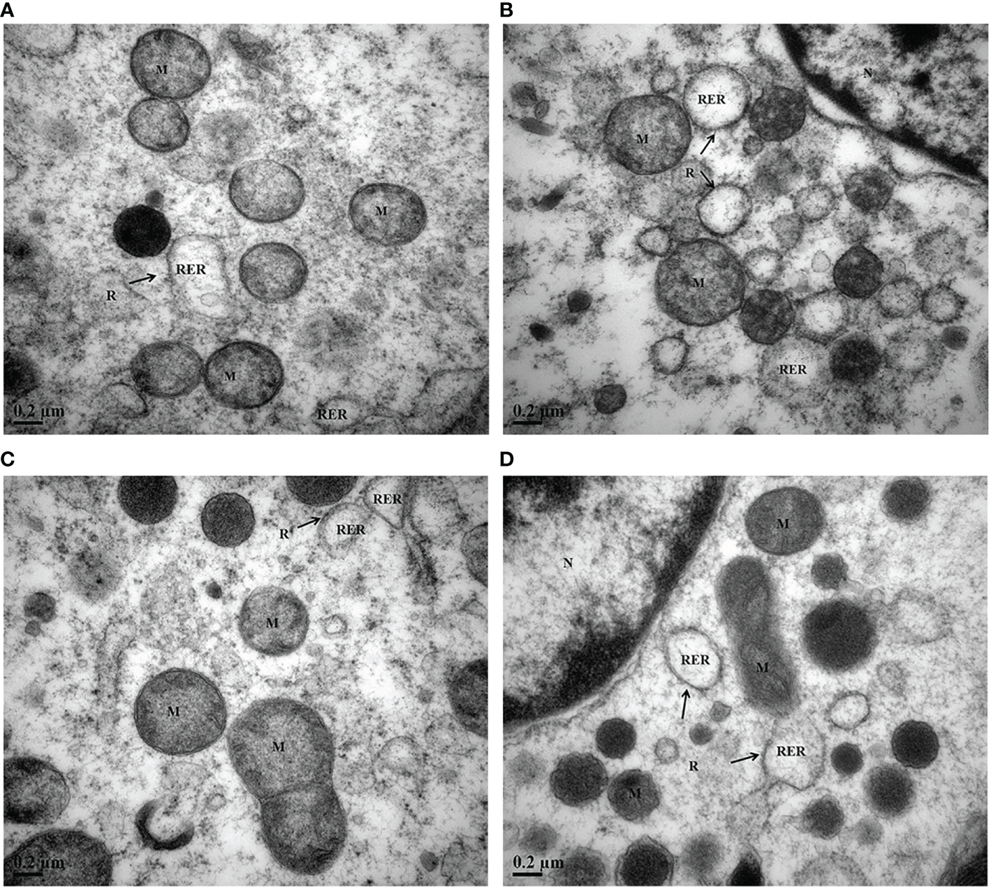 Transmission electron micrographs of the digestive gland of M. coruscus after exposure to MPs and P. lima for 72 h. (A) Control, (B)P. lima exposure, (C) 0.2 mg/L MPs exposure, (D)P. lima and 0.2 mg/L MPs exposure. M, mitochondria; RER, rough-surfaced endoplasmic reticulum; R, ribosome; Mag, ×50000, Scale bar: 0.2μm.