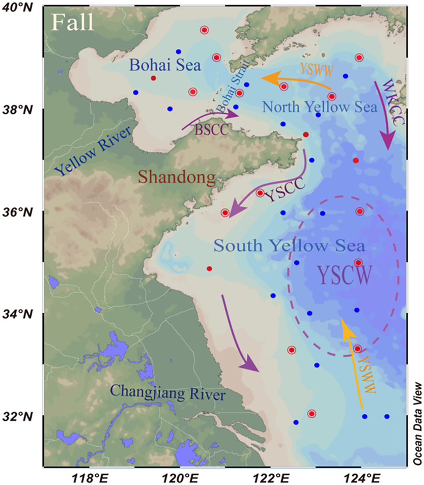 The BS and YS are typical semi-enclosed continental shelf seas, located in the western Pacific Ocean between mainland China and the Korean Peninsula. The BS has the area of 77×103 km2 and average depth of 18 m with the maximum depth of 83 m in the Bohai Strait. The YS has the area of 380×103 km2 and average depth of 44 m with a maximum depth of 140 m. The Yellow River (YR) is the main river entering the BS, with the freshwater influx of ~200×108 m3 a-1 (Xu et al., 2013). The main current in the BS is the Bohai Sea Coastal Current (BSCC), which can carry low-temperature, low-salinity and high nutrients into the YS under the influence of northwest monsoon (Chen, 2009). However, the currents in the YS are complex. The interaction among monsoon, bottom topography, river discharge and the Kuroshio intrusion leads to various circulation regimes and different water masses. The seasonal circulation is mainly reflected in the Yellow Sea Warm Current (YSWW). In summer and autumn, the YSWW moves northward under the influence of southeast monsoon. In winter, the YSWW forms a circulation in the SYS region affected by northeast monsoon (Chen, 2009). This study focused on autumn, when there are the Yellow Sea Coastal Current (YSCC) in the west, the South Korean Coastal Current (WKCC) in the east, and the YSWW in the middle of the SYS, which can move northward through the Bohai Strait into the BS. In addition, there is a typical seasonal cold water mass in the YS, namely the Yellow Sea Cold Water (YSCW). The YSCW (<12°C) mainly appears in summer and autumn when the southwest monsoon prevails. The YSCW exhibits low temperature and high salinity characteristics (Wang et al., 2014). In addition, the low DO and pH values also are found in the YSCW (Zhai, 2018; Guo et al., 2020).