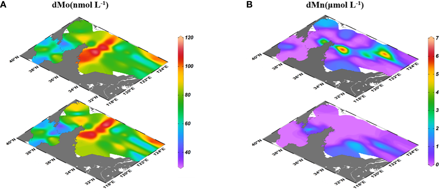 Distributions of dMo (A) and dMn (B) in surface and bottom seawaters of the BS and YS.