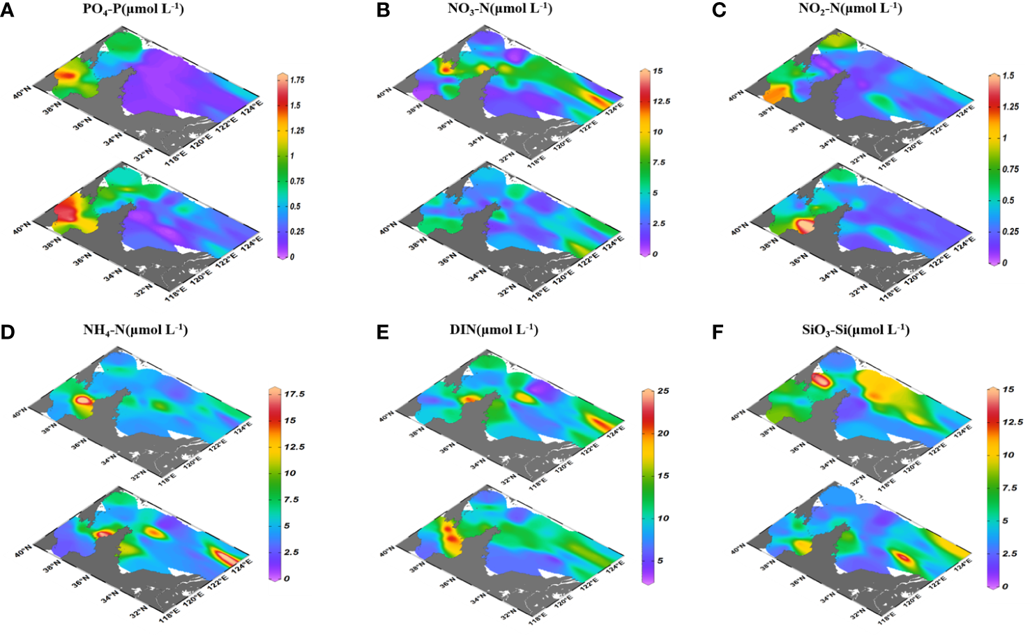 Distributions of PO4-P (A), NO3-N (B), NO2-N (C), NH4-N (D), DIN (E) and SiO3-Si (F) in surface and bottom seawaters of the BS and YS.