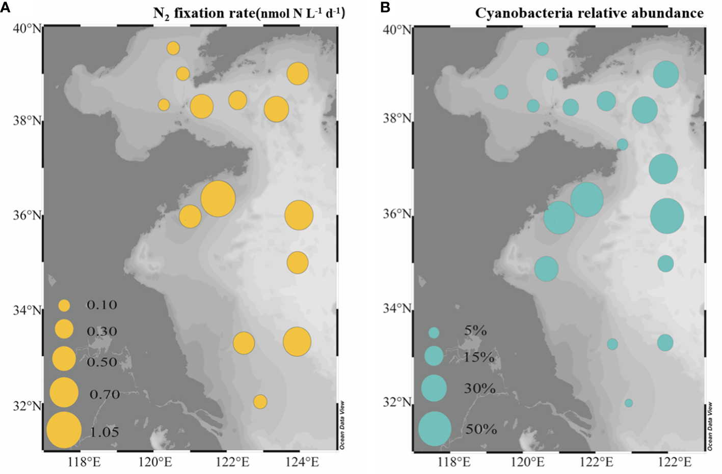 The NFRs and relative abundances of cyanobacteria in surface seawaters of the BS and YS were determined. The NFRs were 0.11-1.05 nmol N L-1 d-1. The highest NFRs were in the SYS (0.55 ± 0.27 nmol N L-1 d-1), followed by the NYS (0.42 ± 0.09 nmol N L-1 d-1) and the BS (0.13 ± 0.17 nmol N L-1 d-1; Figure 5A). The highest NFR appeared in north of the SYS (near 36°N). Similarly, the highest relative abundances of cyanobacteria were in the SYS (27.0 ± 19.3%), followed by the NYS (18.7 ± 10.1%) and BS (7.0 ± 10.2%), with the highest values in north of the SYS (near 36°N; Figure 5B).