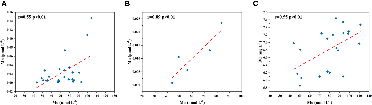 The horizontal and vertical differences of dMo could not be attributed solely to the freshwater dilution effect. The importance of Mn cycling to Mo behavior has been found. It has been suggested that the removal of from surface seawaters was associated with Mn oxidation and adsorption by freshly formed MnOx phases, which would settle on the sediments (Dellwig et al., 2007). In this study, both dMo and dMn presented the highest values in the SYS, followed by the NYS, and the lowest in the BS. This distribution was opposite to DO concentrations, likely suggesting that high DO level might favor the formation of Mn oxides and associated Mo adsorption. There was a significant positive correlation (r=0.55, p<0.01; Figure 7A) between dMo and dMn in the BS and YS except for the area with extremely high dMn values. The more significant correlation was found in the BS (r=0.89, p<0.01; Figure 7B), suggesting that the role of the adsorption to inorganic particles to remove dMo in the BS was more important than in the YS.