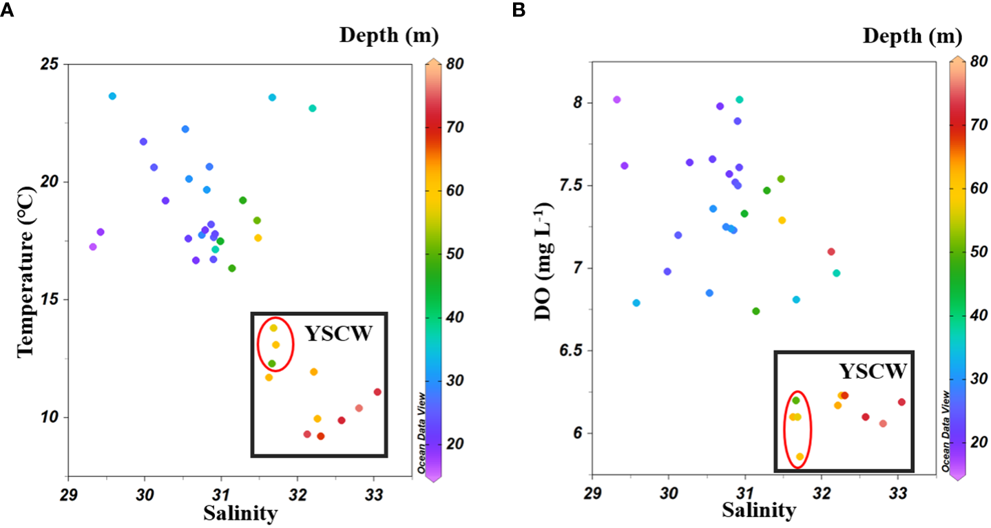 Scatter plots of bottom sea water salinity and temperature (A), and salinity and DO (B) in the BS and YS. The Yellow Sea Cold Water (YSCW) was boxed in black rectangle and stations in the NYS affected by YSCW circled in red oval.