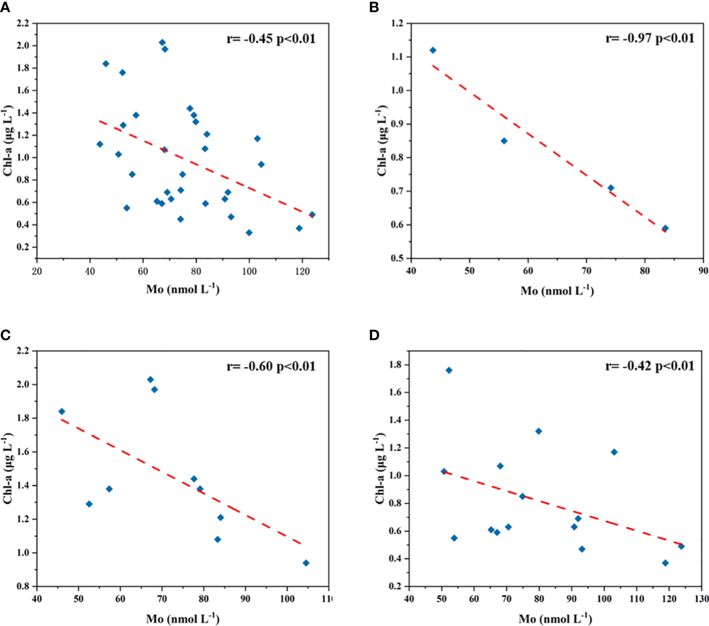 Correlations of dMo with Chl-a in the BS and YS (A), the BS (B), the NYS (C) and the SYS (D).