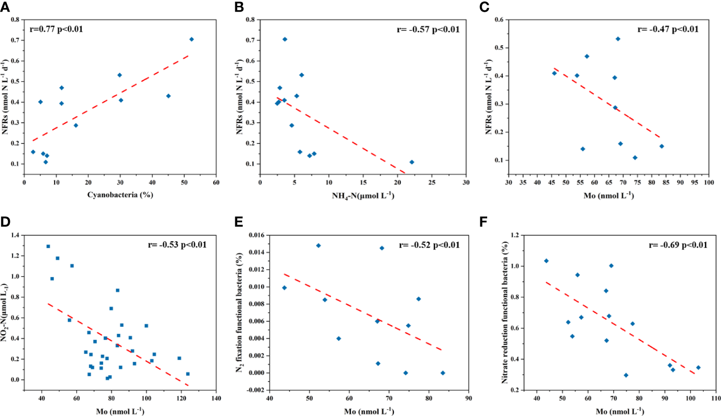 Correlations of the relative abundance of cyanobacteria with NFRs (A), NH4-N with NFRs (B) in the BS and YS, dMo (<90 nmol L-1) with NFRs in the YS (C), dMo with NO2-N (D), dMo with N2 fixation functional bacteria (E) and dMo with nitrate reduction functional bacteria (F) in the BS and YS.
