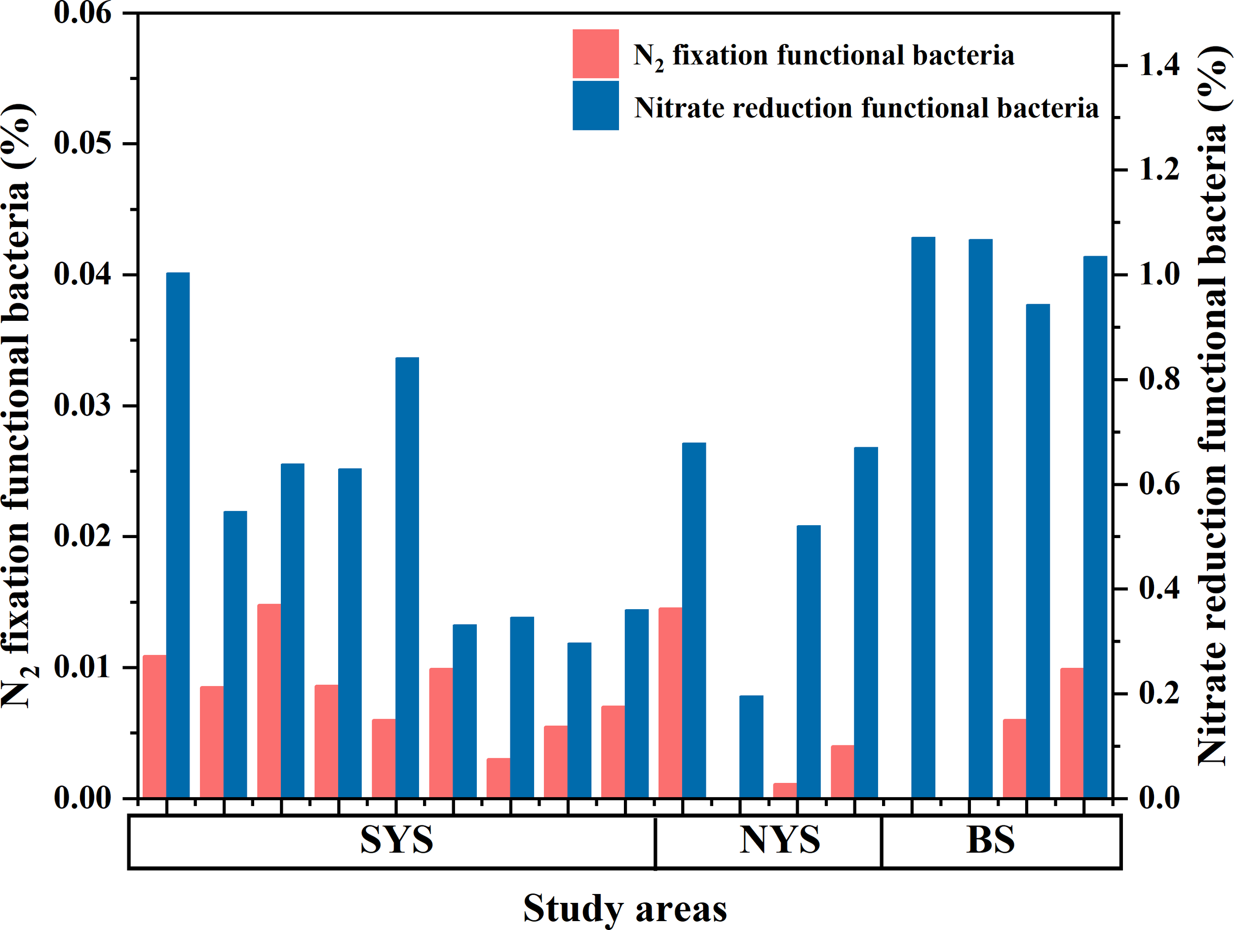 The relative abundances of bacteria with N2 fixation and nitrate reduction function. The function prediction was performed by the FAPROTAX software based on 16s rRNA data.