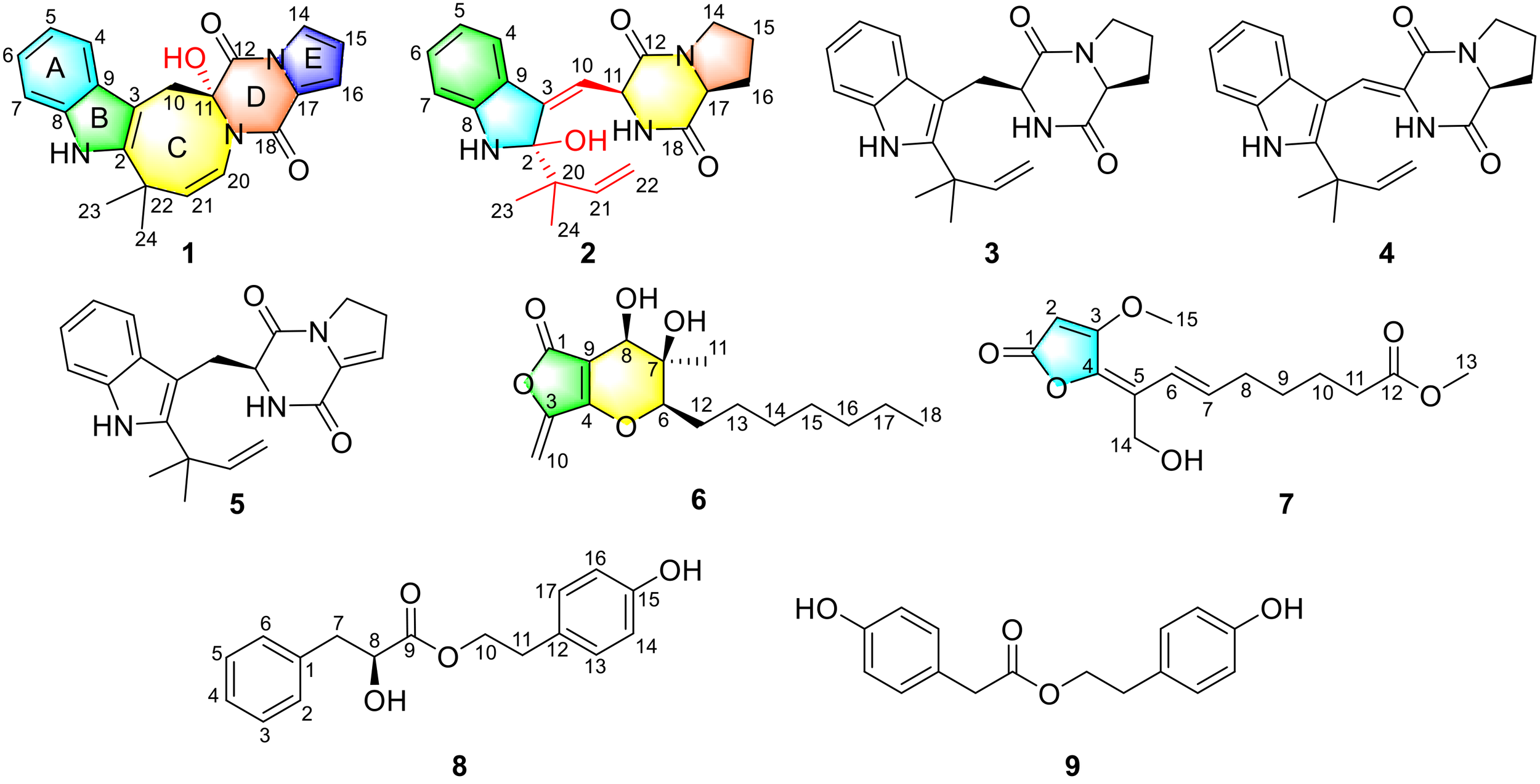 In our ongoing studies to search for new bioactive compounds from the mangrove-derived fungi (Liu et al., 2021; Hou et al., 2021; Zhang et al., 2022), the strain Penicillium sp. LA032, isolated from the rhizospheric soil of a mangrove ecosystem, was subjected to fermentation on rice. The EtOAc extract showed cytotoxic activity, and its high performance liquid chromatography (HPLC) profiles indicated the presence of abundant secondary metabolites. Then, the large-scale fermentation on rice was performed. The fractionation of the EtOAc extract of this fungus led to the isolation of two new PIDAs penicamides A and B (1 and 2), and three new polyketides penicinones A−C (6−8), along with four known compounds, deoxybrevianamide E (3) (Song et al., 2012), brevianamide V (4) (Song et al., 2012), 12,13-dehydroprolyl-2-(1,1-dimethylallyltryptophyl)diketopiperazine (5) (Steyn, 1973), and 4-hydroxyphenethyl 2-(4-hydroxyphenyl)acetate (9) (Wang et al., 2009) (Figure 1). The details of the isolation, structure elucidation, and biological evaluation of these compounds are reported herein. In addition, the proposed biosynthetic pathways of compounds 1−5 are reported.
