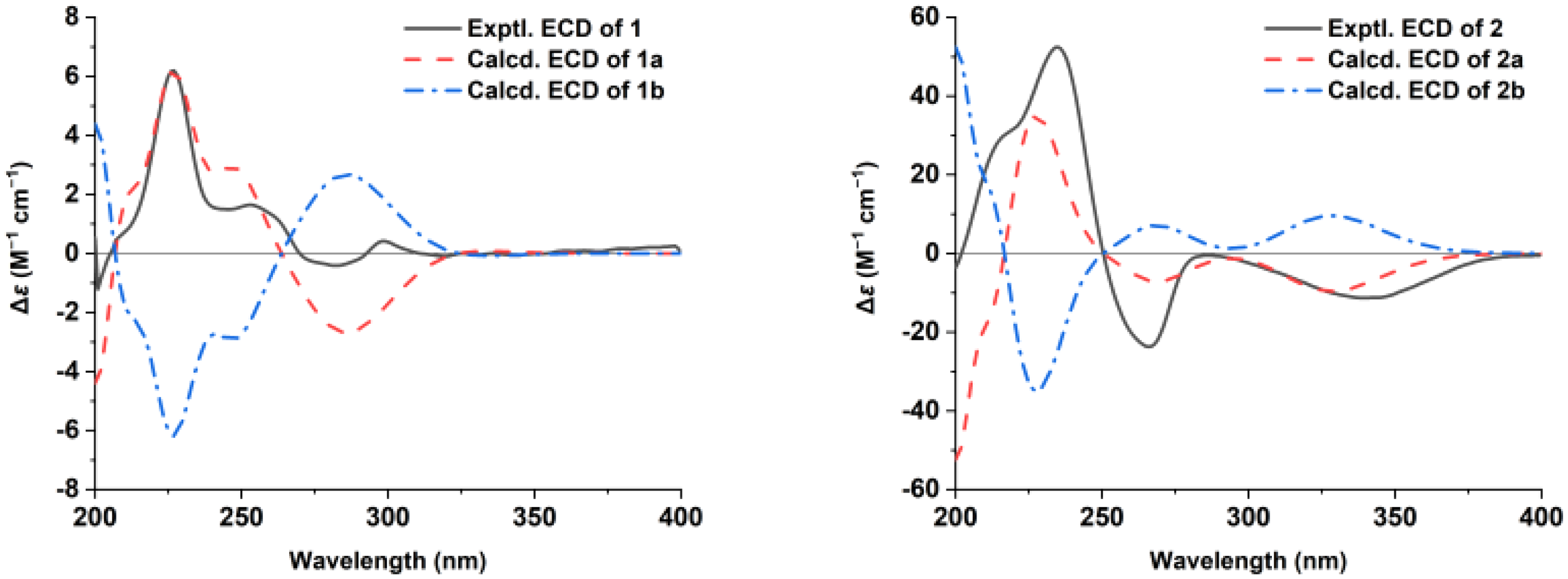The absolute configuration for compound 1 was determined unequivocally by the comparison of the experimental and calculated ECD curves. The ECD spectra of 11R-(1a) and 11S-(1b) were performed using the time-dependent density functional theory (TD-DFT) at the CAM-B3LYP/6-311G(d,p) level. The calculated ECD spectrum of 11R-(1a) matched well with the experimental one of 1 (Figure 3), which allowed the assignment of the absolute configuration of 1 as 11R.