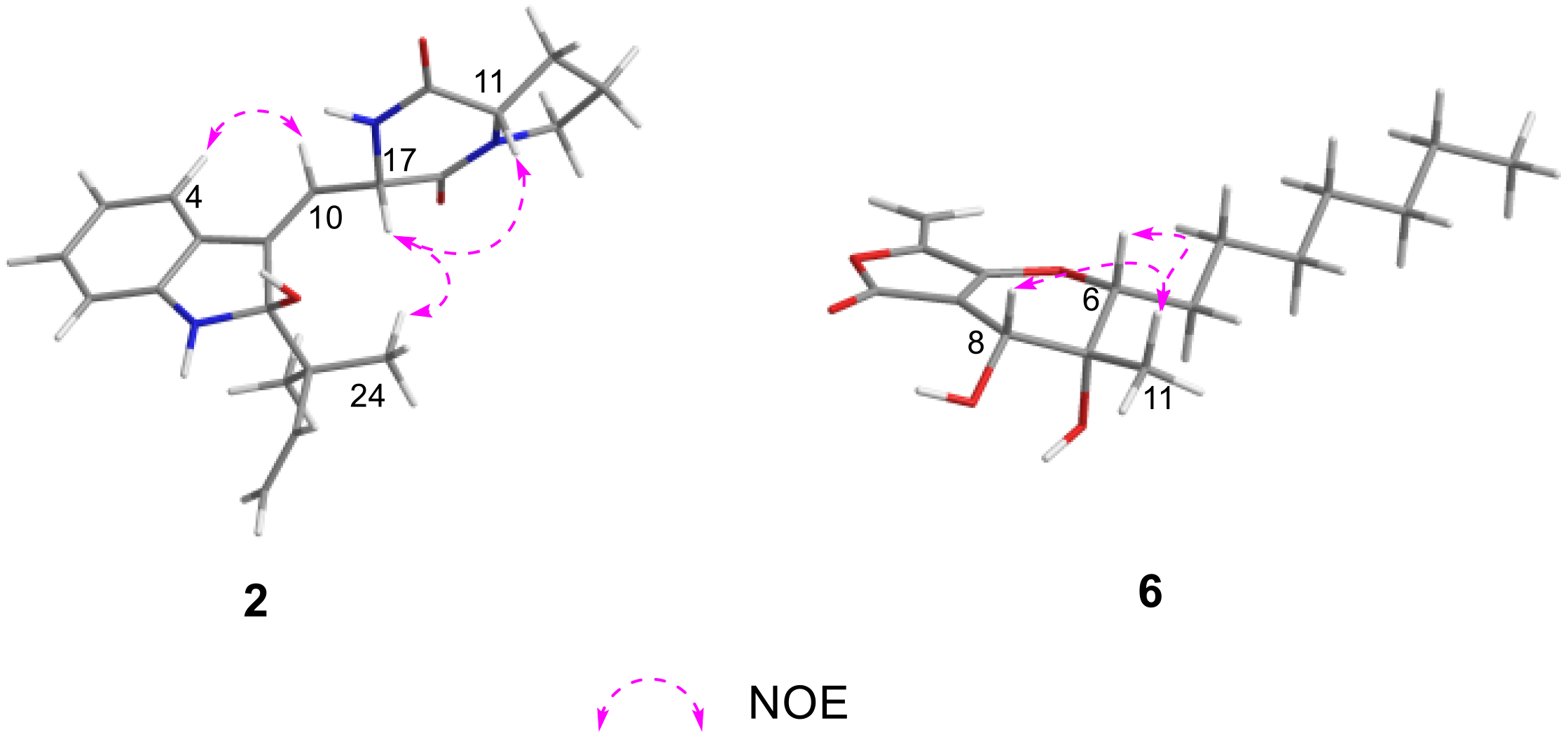 Penicilamide B (2) had a molecular formula of C21H25N3O3 as deduced from the HRESIMS and 13C NMR data, with 11 degrees of unsaturation, which is 16 mass units higher than that of deoxybrevianamide E (3) (Song et al., 2012). The 1H, 13C, and HSQC spectroscopic data (Table 1 and Figures S7–S9) suggested the presence of two methyls, four methylenes (one sp2 methylene), two sp3 methines, six olefinic/aromatic methines, and seven quaternary carbons including two amide carbonyls (δC 164.3 and 165.7). The 1H NMR and 13C NMR data (Table 1) of 2 were similar to those of the coisolated compound 3, with slight differences in the chemical shift values of C-2, C-3, C-9, C-10, C-11, and C-20, suggesting their structural similarity. A further analysis of their NMR data indicated that the olefin C-2/C-3 in 3 was replaced by the olefin C-3/C-10 in 2 and an extra hydroxy group was located at C-2 in 2, as supported by the HMBC correlations (Figures 2 and S11) from 1-NH (δH 6.26), H-21, H3-23, and H3-24 to the sp3 quaternary carbon C-2 (δC 98.4) and C-20, from H-4 (δH 7.31) to the olefinic quaternary carbon C-3 (δC 149.0), from H-10 (δH 6.38) to C-2, C-3, C-9, C-11, and C-12 and from H-11 (δH 5.26) to C-3 and the olefinic methine carbon C-10 (δC 121.1), together with the 1H-1H COSY cross-peak (Figures 2 and S10) of H-10/H-11. In the nuclear overhauser effect spectroscopy (NOESY) spectrum (Figures 4 and S12), the NOESY correlation of H-4/H-10 suggested the olefin C-3/C-10 as Z geometry. In addition, the cross-peaks of H-11 with H-17 and H3-24 suggested that these protons were cofacial, implying the existence of two possible configurations 2R,11S,17S-(2a) and 2S,11R,17R-(2b). Lastly, the absolute configuration of 2 was also established by ECD calculations. The experimental ECD curve was consistent with the calculated one of 2R,11S,17S-(2a), indicating the 2R,11S,17S configuration of 2. Finally, compound 2 was established as a PIDA featuring a rare 3-methyleneindolin-2-ol moiety.