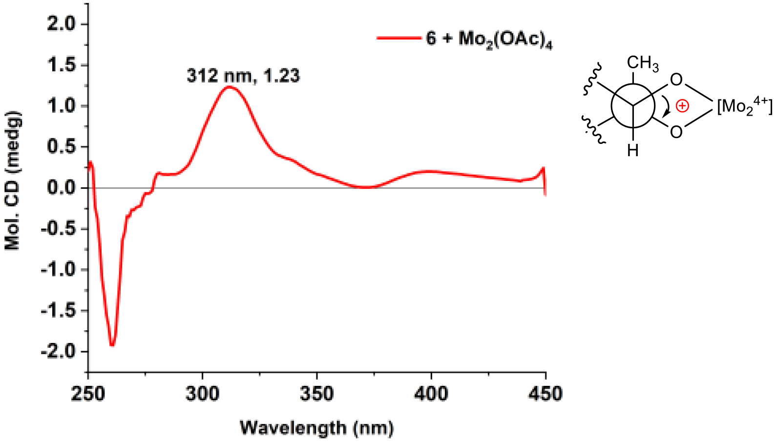 The ligand-compound 6 (0.2 mg) was added into a dry solution of Mo2(OAc)4 (0.7 mg) in dimethyl sulfoxide (DMSO) (400 μl) and was subjected to CD measurements. Firstly, the ECD spectrum was recorded immediately after mixing. Subsequently, its evolution was monitored every 10 min until stationary. Finally, the inherent ECD was subtracted. The diagnostic band observed at ca. 312 nm in the induced ECD spectrum was correlated to the absolute configuration of the 7,8-diol moiety on the basis of Snatzke’s regulations (Frelek et al., 1997).