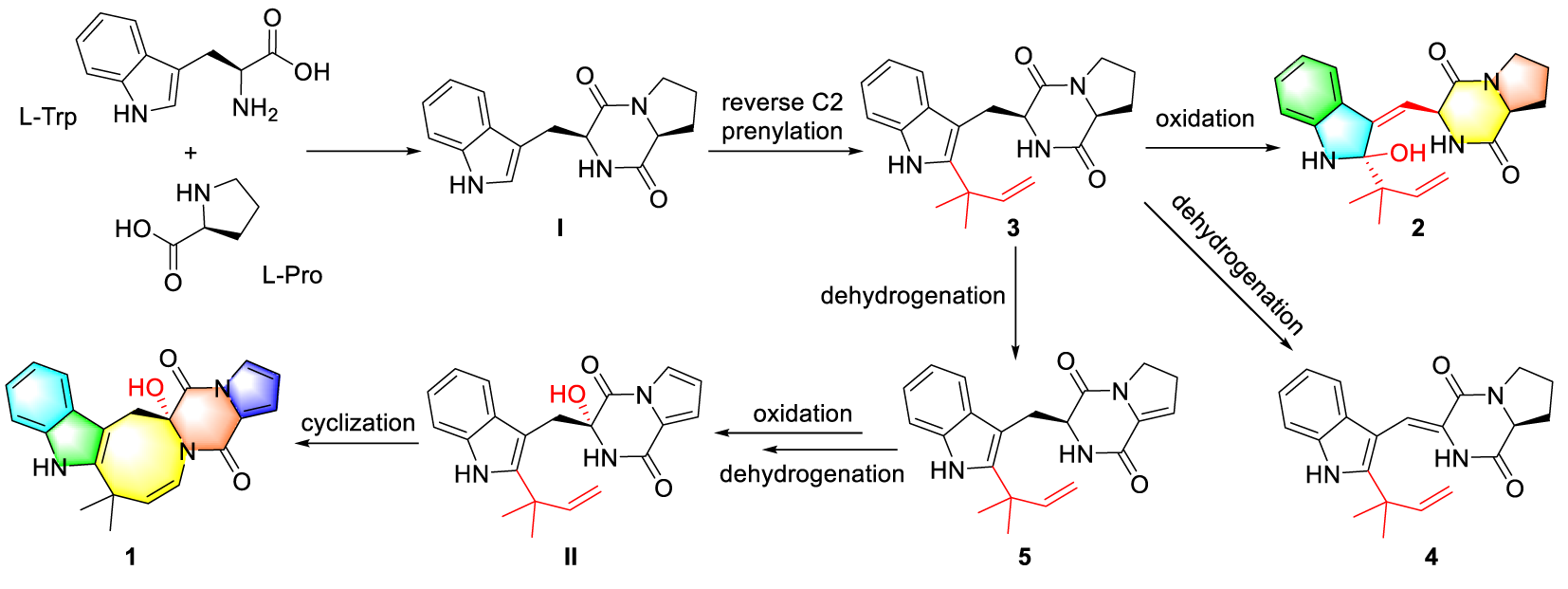 Prenylated indole diketopiperazine alkaloids (PIDAs), featured by tryptophan-containing cyclodipeptides and one or more isoprene units, are an important family of fungal secondary metabolites mainly produced by the genera Penicillium and Aspergillus (Li, 2010; Peng et al., 2014; Ma et al., 2016). Biogenetically, the skeleton of PIDAs could be derived from the condensation of L-tryptophan with another amino acid catalyzed by a non-ribosomal peptide synthetase, followed by subsequent modifications by tailoring enzymes to form a structural variability of this class of natural products (Ma et al., 2016; Wohlgemuth et al., 2017). PIDAs have also attracted considerable interest from organic chemists due to their high structural diversity with significantly biological activities (Baran and Corey, 2002; Ma et al., 2016; Li et al., 2019; Yang et al., 2021).