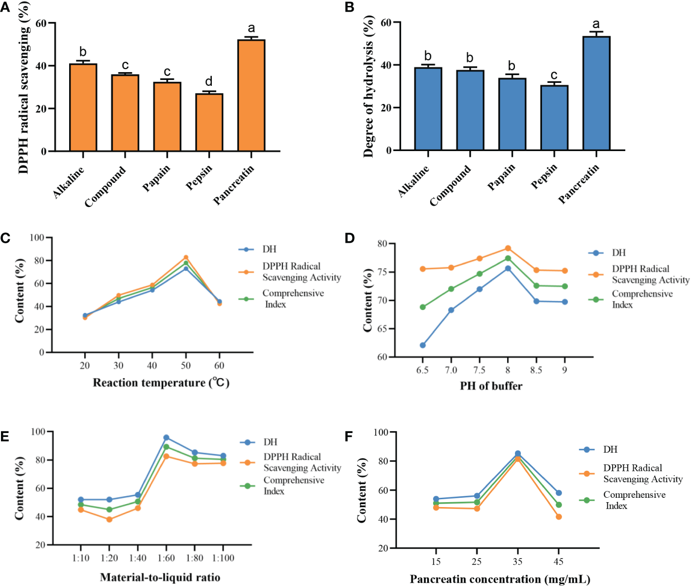 Preparation of protein enzymatic hydrolysates of C-PC. Effects of different proteases on the (A) DPPH radical scavenging activity. (B) Degree of hydrolysis (DH). DH and DPPH radical scavenging activity vary with effects of (C) Reaction temperature. (D) PH of buffer. (E) Material-to-liquid ratio. (F) Pancreatin concentration. a-dValues with the different letters indicate a significant difference (p < 0.05).