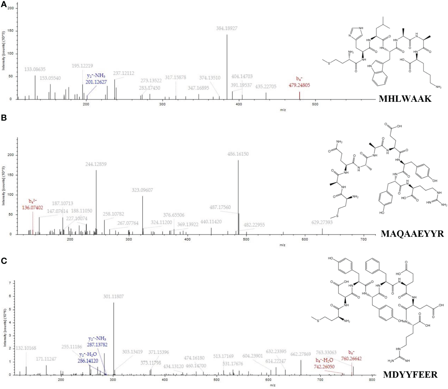 Identification of de novo peptide sequences of C-PC was done via EASY-Nlc1000 chromatography system coupled to an LTQ Orbitrap Velos Pro mass spectrometer (Thermo Finnigan, Bremen, Germany) in accordance with the previously published methods (Lassoued et al., 2015; Agrawal et al., 2016). The identified peptides were synthesized via an Fmoc-protected solid-phase procedure by Cellmano Biotech Co., Ltd. (Hefei, China).