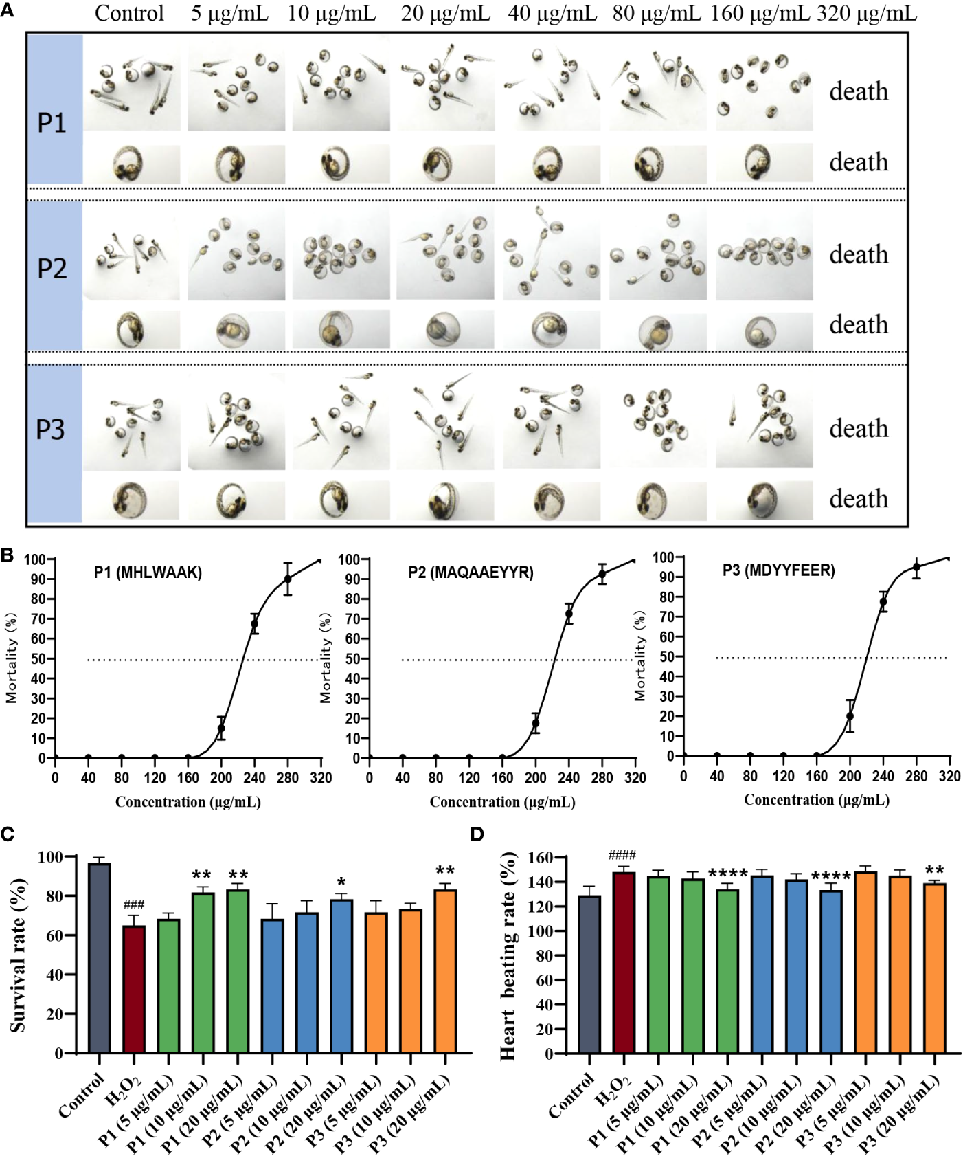 Healthy zebrafish embryos at 24 hpf were selected and treated with different concentrations of peptides (5, 10, 20, 40, 80, 160, 320 μg/mL) in 24-well cell culture plates (10 eggs per well, with 2 mL of bathing medium) for continuous development until 48 hpf. The morphological development of zebrafish was observed and photographed using a dissecting microscope (Olympus, Tokyo, Japan).