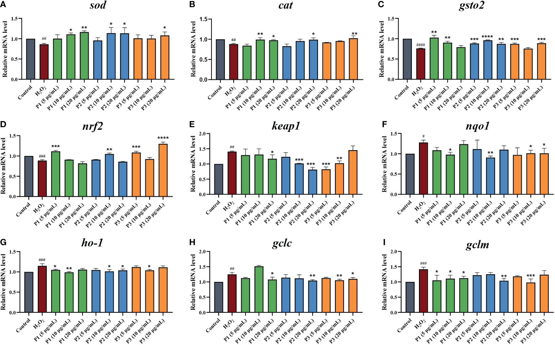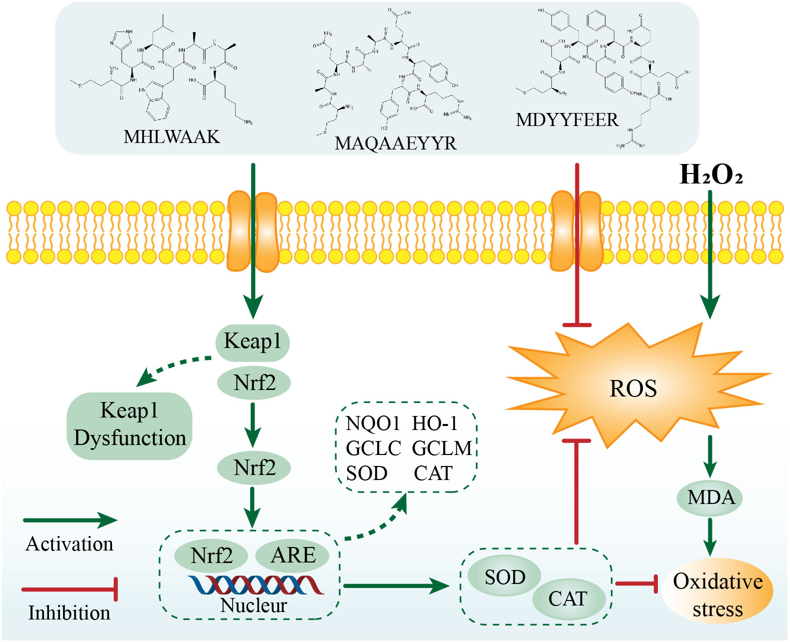 Total three novel active peptides, MHLWAAK (Met-His-Leu-Trp-Ala-Ala-Lys), MAQAAEYYR (Met-Ala-Gln-Ala-Ala-Glu-Tyr-Tyr-Arg), and MDYYFEER (Met-ASP-Tyr-Tyr-Phe-Glu-Glu-Arg) were isolated and purified from pancreatin hydrolysate of C-PC. These synthesized peptides displayed high DPPH and ABTS radical scavenging ability. In addition, in a zebrafish model, the three peptides significantly protected zebrafish embryos from H2O2-induced oxidative injury without toxicity by inhibiting ROS generation, preventing MDA formation, and upregulating the activities of SOD and CAT. Further experiments showed that these peptides could significantly regulated oxidative stress via activating the Nrf2 signaling pathway.