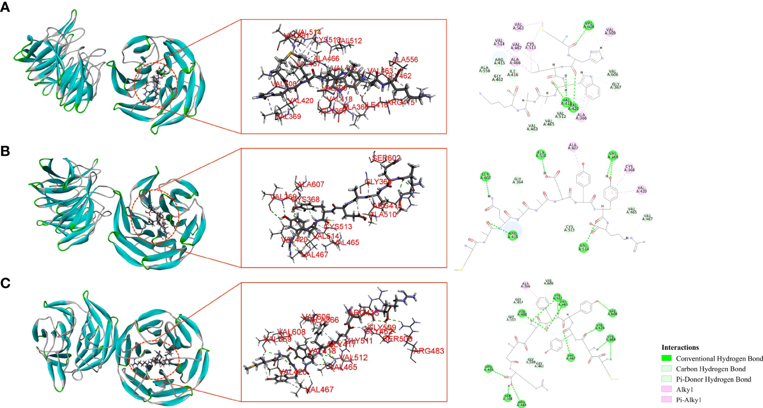 In our study, five different proteases (alkaline, compound, papain, pepsin, and pancreatin) were used to hydrolyze C-PC under the same conditions. The antioxidant activities of different enzymatic hydrolysates were determined by both degree of hydrolysis (DH) assay and DPPH radical-scavenging activity. As shown in Figures 1A, B, pancreatin was demonstrated to have the highest radical-scavenging activity and DH, and both were more than 50%. Pancreatin is one of the major proteolytic enzymes in enzymatic hydrolysis experiments, and is readily available and relatively cheap. Besides, it can also activate zymogens such as carboxypeptidase and phospholipase. Therefore, we selected pancreatin as a candidate for further C-PC hydrolysis to produce active peptides.