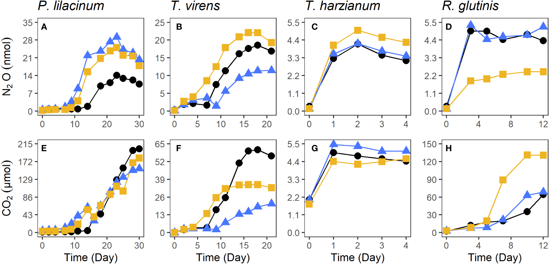 The production of N2O and CO2 by P. lilacinum(A, E), T. virens(B, F), T. harzianum(C, G), and R. glutinis(D, H) isolated from salt marsh sediments. Each color and symbol combination represents one of the three replicates.