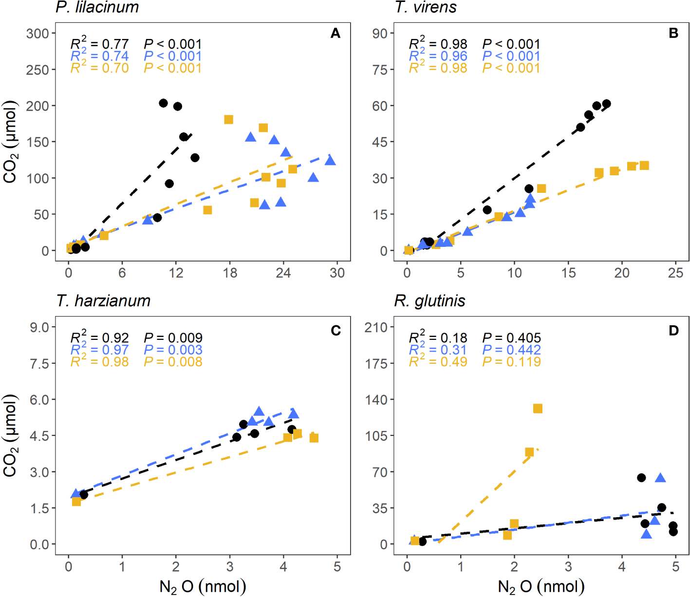 Correlation between N2O and CO2 production by salt marsh sediment fungi P. lilacinum(A), T. virens(B), T. harzianum(C), and R. glutinis(D). Each color represents one of the three replicates.