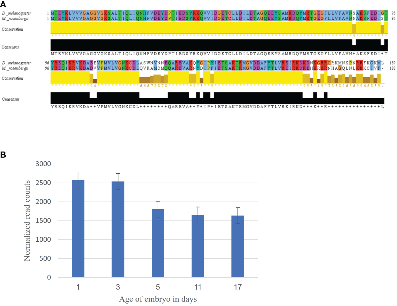 Mining of the Ras gene in M. rosenbergii. (A) Alignment of the Ras amino acid sequence from D. melanogaster with a putative M. rosenbergii Ras based on transcriptomic libraries. High conservation of the protein sequence alignment was found using Jalview (with default settings). For each position in the sequence alignment, the conservation rate and the consensus sequence are shown below. (B) MrRas expression pattern in embryos of different ages. The x-axis represents embryo development days, and the y-axis, normalized read counts. The error bars represent standard deviation.