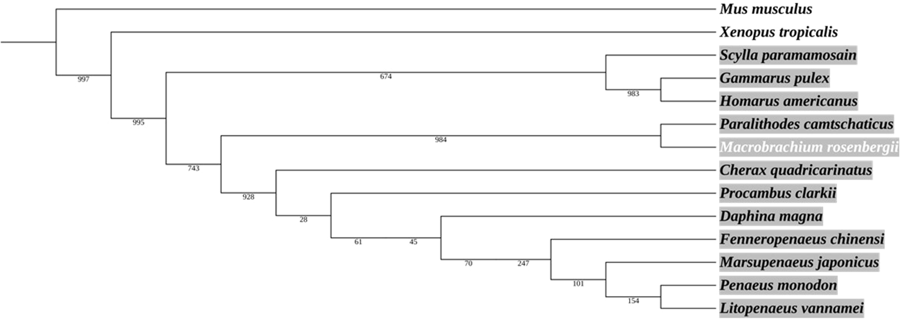 Phylogenetic analysis of Ras protein in crustaceans, including M. rosenbergii. The area marked in grey represents the crustaceans. The neighbor-joining tree was constructed according to the alignment of the entire Ras amino acid sequence. The numbers alongside the branches represent bootstrap values. The rodent Mus musculus and the amphibian Xenopus tropicalis served as outgroups.