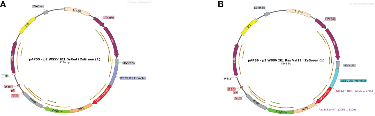 Plasmid map of pAP55 and pAP59. (A) Positive control plasmid with pAP 55 WSSV IE 1 promoter followed by two reporter genes DsRed and ZsGreen, indicated in red and green, respectively. (B) Plasmid pAP59; mutated MrRas is indicated in red, and the reporter gene ZsGreen, in green.