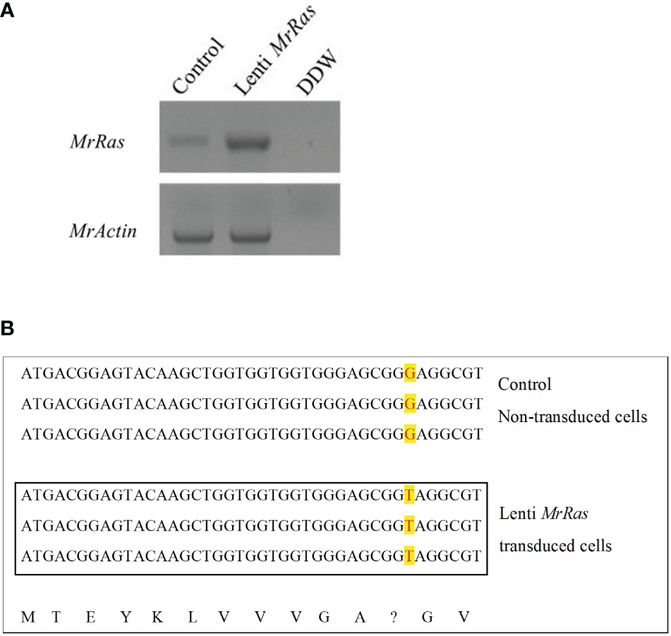 Integration of mutated lenti-MrRas into M. rosenbergii embryonic primary cell culture. (A) Gel of mutated Ras expression in transduced cells in culture (lenti-MrRas, top A). RNA extractions were performed after 18 days in culture. Control – non-transduced M. rosenbergii cells; DDW - doubly distilled water. MrActin served as the positive control (bottom). (B) Sanger sequencing of RNA isolated from control (top) and mutated lenti MrRas transduced cells (in box); the three lines in each box are biological replicates. The change in nucleotide from guanine to thymine may be seen in the mutated lenti-MrRas transduced cells compared to control cells (red over yellow background). The deduced amino acids from the sequences are presented in the bottom line. A question mark indicates the point mutation.